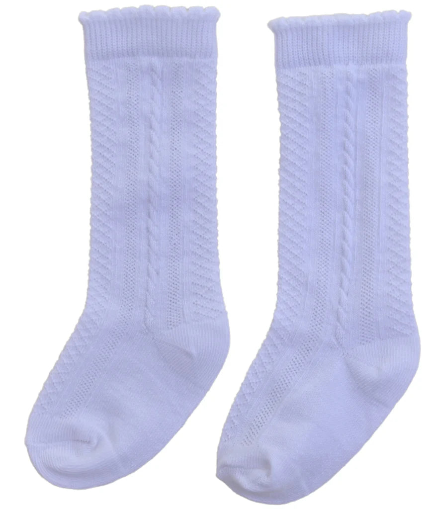 These lovely classic cable ribbed socks are made in wonderfully soft cotton-rich yarn. The edge of the welt is gently scalloped and the socks feature fully formed heels and toes.