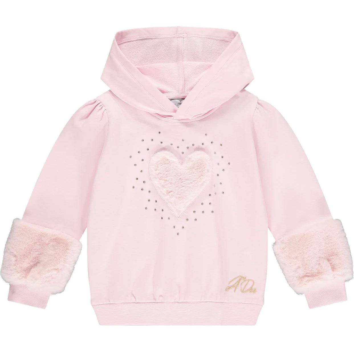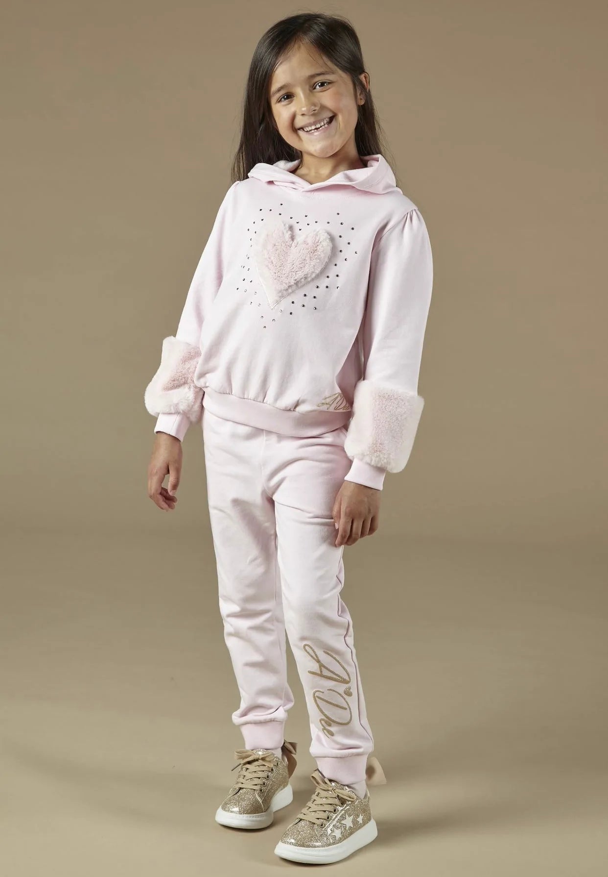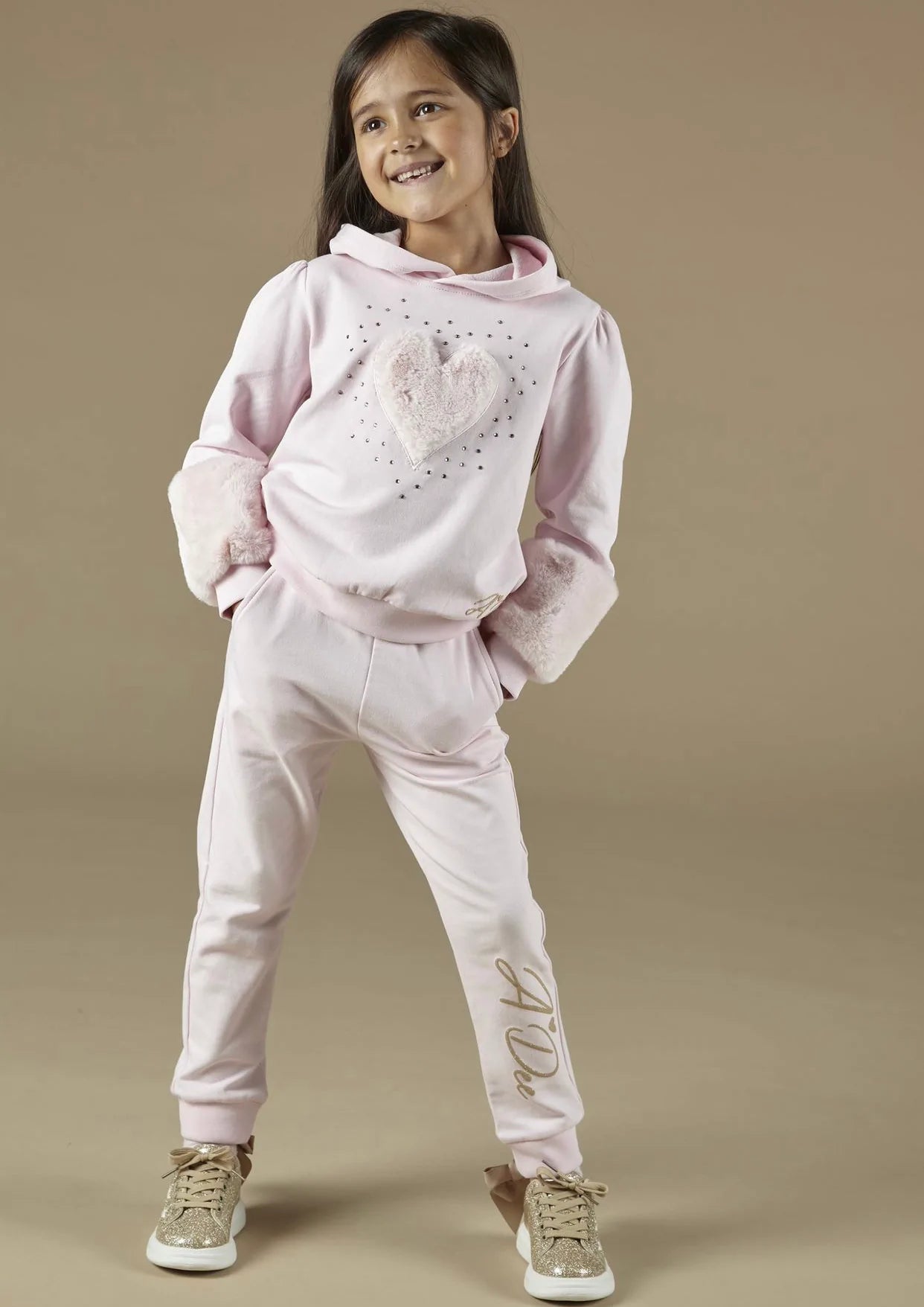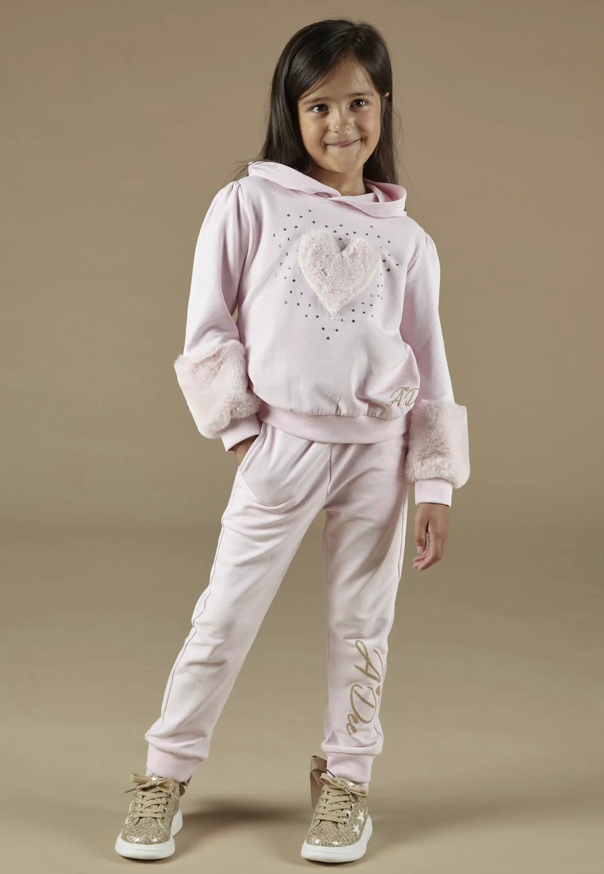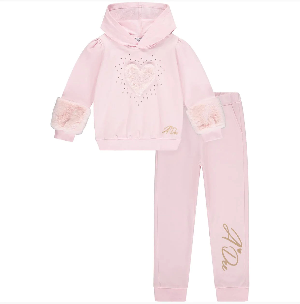 Pink Hooded tracksuit with large faux fur heart and scattered diamante art work on front of sweatshirt including faux fur detail on bottom of sleeves finished with glitter print logo on both.