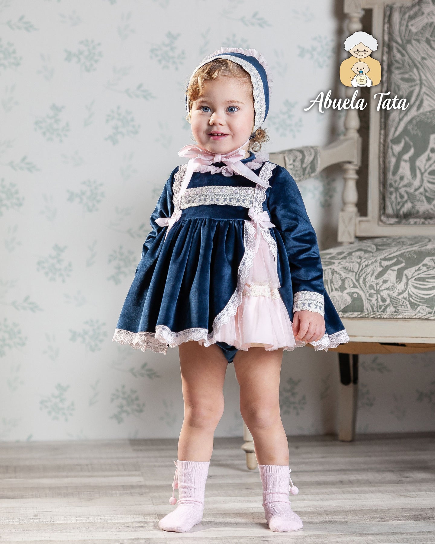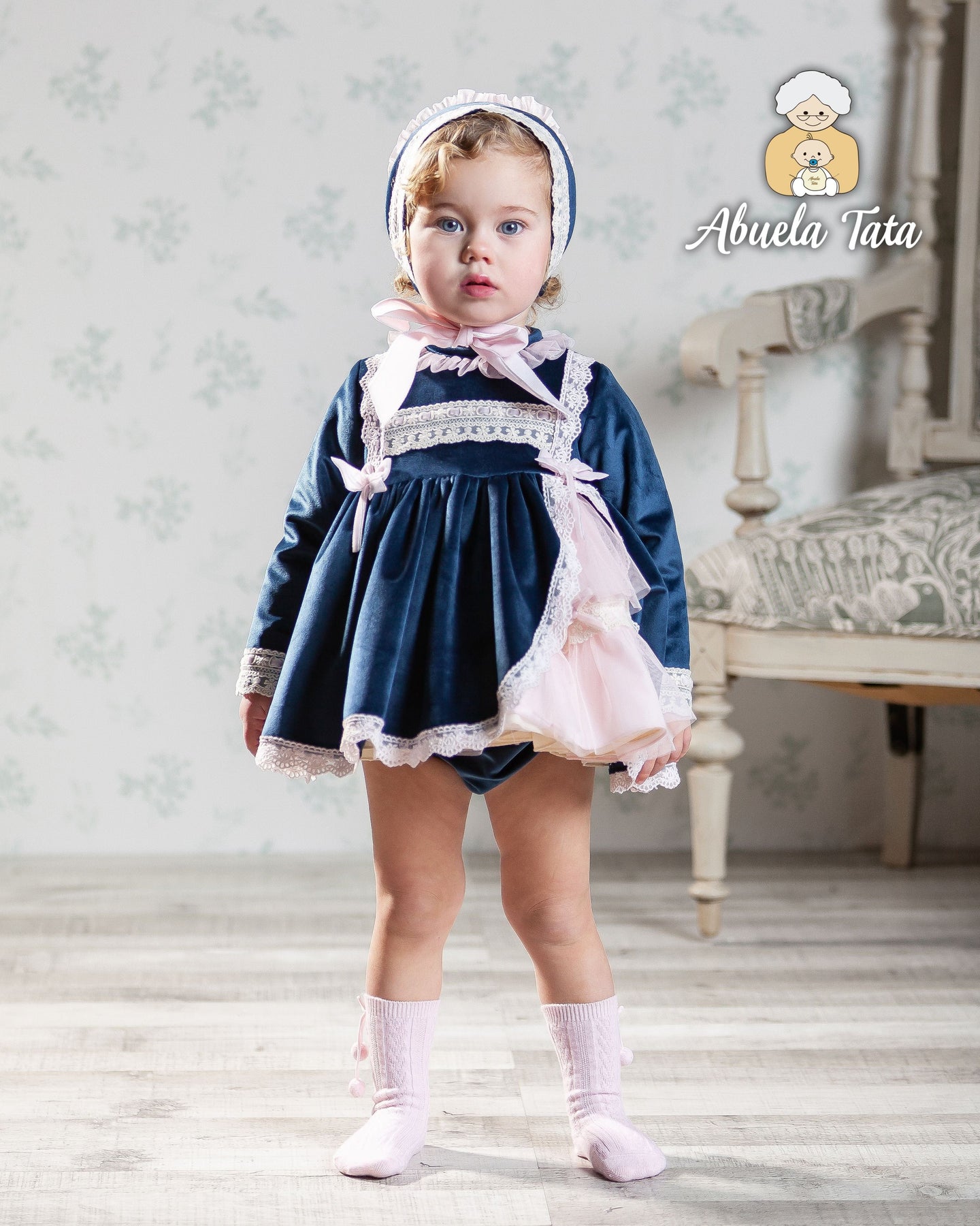 Abuela Tata *Navy Blue Velvet Dress Pants & Bonnet Set With Pink Bows brings a perfect touch of elegance to your little one's wardrobe. Crafted from luxurious velvet, the dress and bonnet come adorned with soft pink bows, creating a look that's as stylish as it is comfortable.