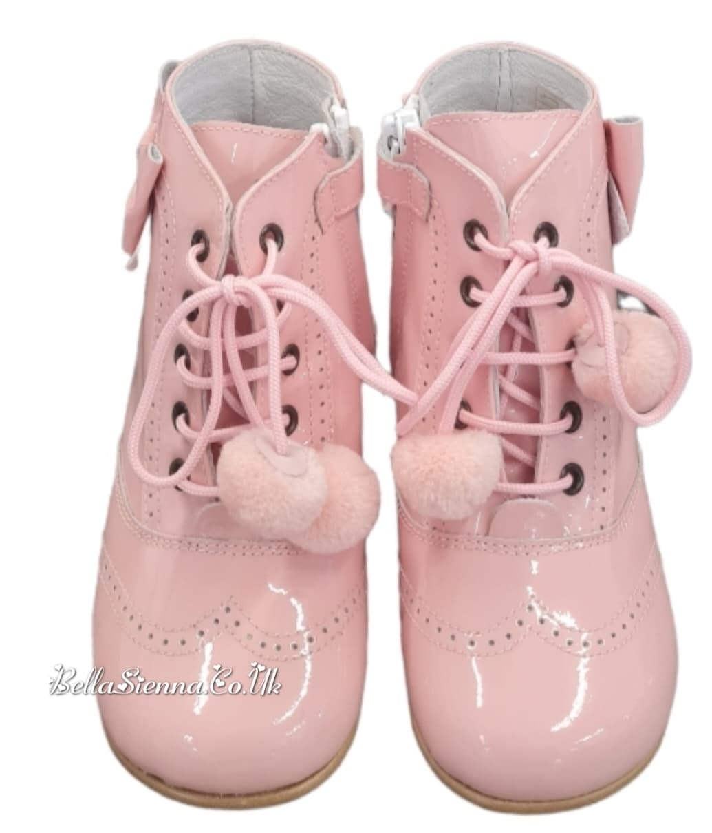 Andanines Girls Pink Patent Leather Boots With Bows & Pom Poms