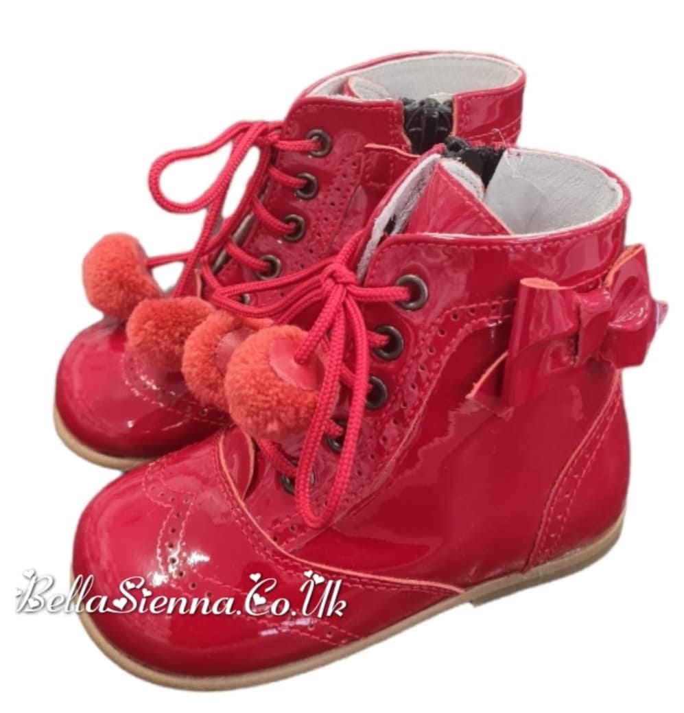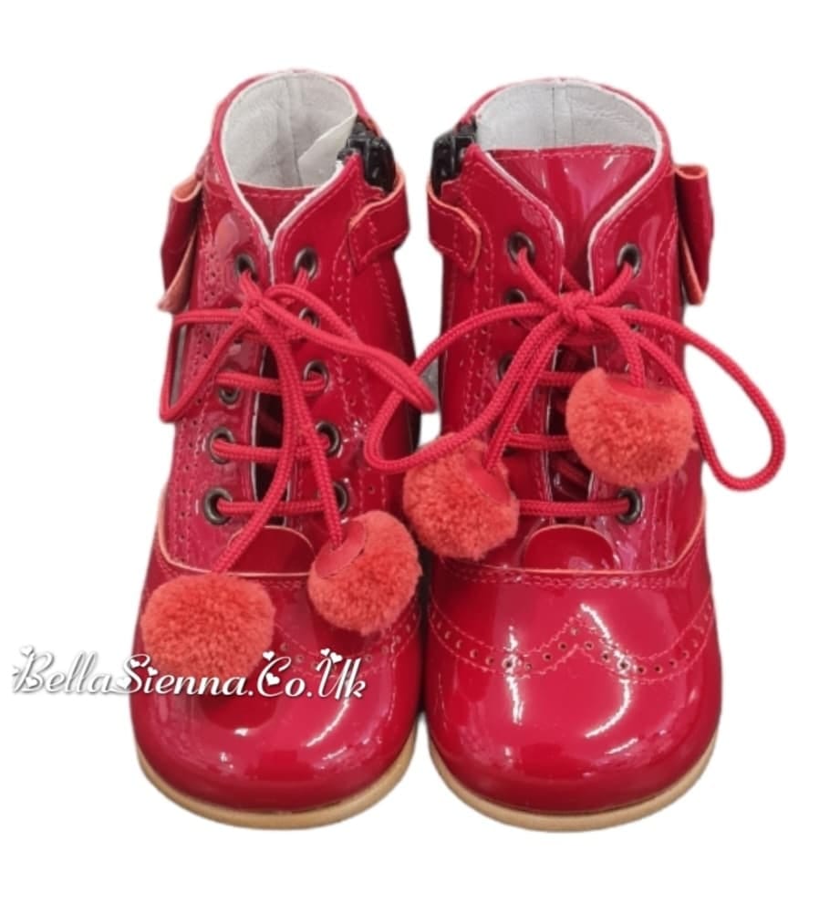 Andanines Girls Red Patent Leather Boots With Bows & Pom Poms