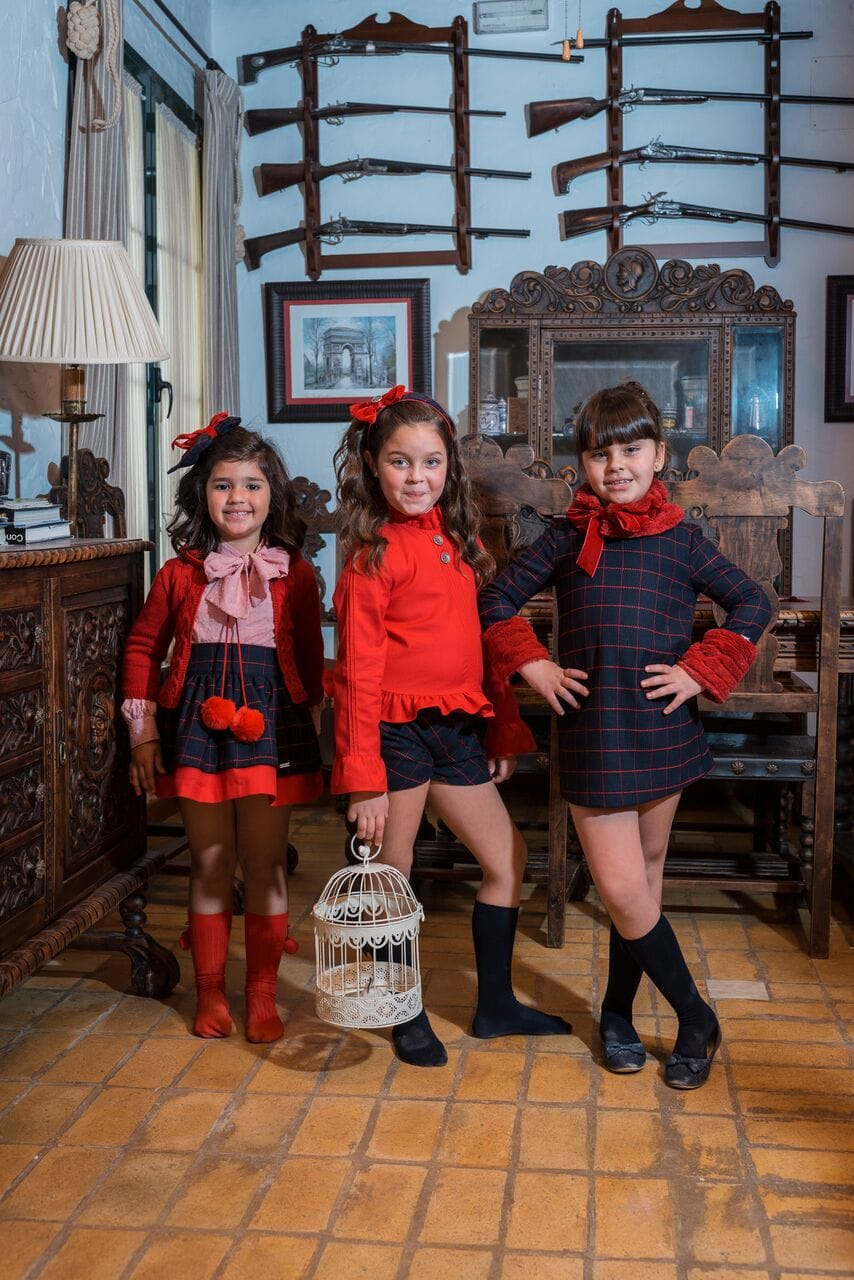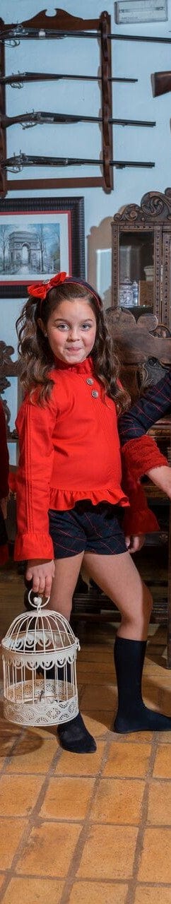 Girl's red and navy girls short set made in our luxuriously soft fabric. Red ruffle neck blouse with decorative buttons also button fastening at the back, perfect for easy changing. The shorts are navy with red check with an adjustable waistband decorative button on front with red trim. The shorts have an hidden zip fastening to the side.