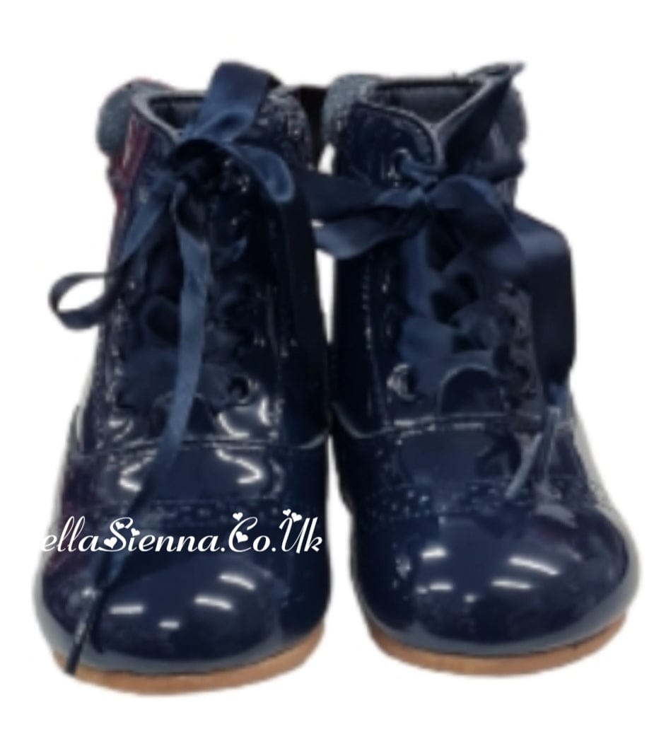 These stylish patent leather boots provide a fashionable look for any outfit. The ribbon laces and bow on the back add a touch of charm to this navy boot. Ideal for any occasion, these boots make a great addition to any wardrobe.
