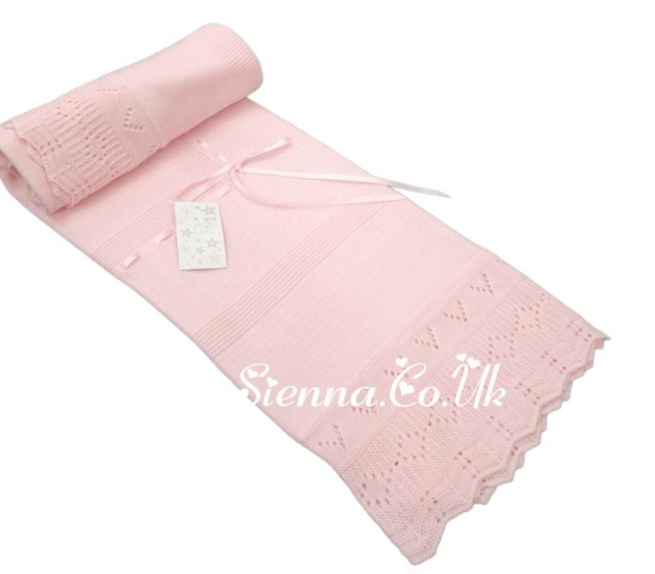 The Traditional Newborn Shawl makes a stunning gift for a new arrival. Delicately knitted from super soft fabric that's gentle on skin, and finished with a pretty scalloped edge and pretty pink ribbon.