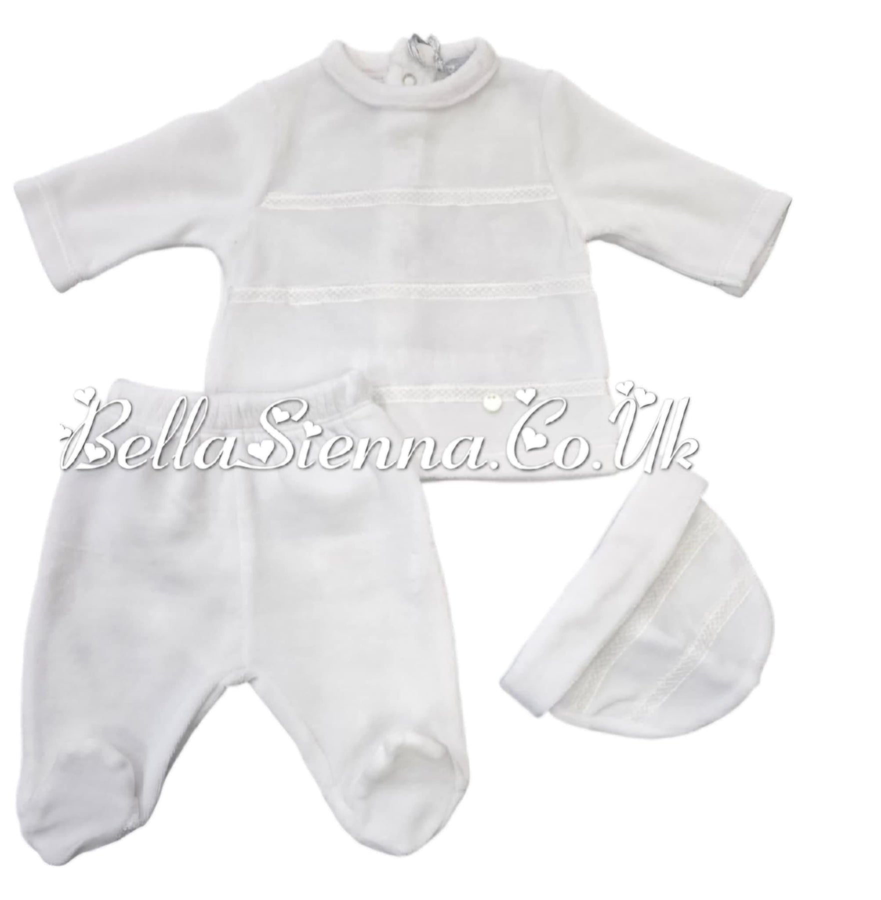 Experience ultimate comfort with our Blues Baby White Velour Unisex Three Piece Set. Made from soft white velour, the set includes a top, leggings, and hat, all in a unisex design. The top features a decorative button, adding a touch of style to the cozy set. Perfect for any baby, this set is a must-have for ultimate comfort.
