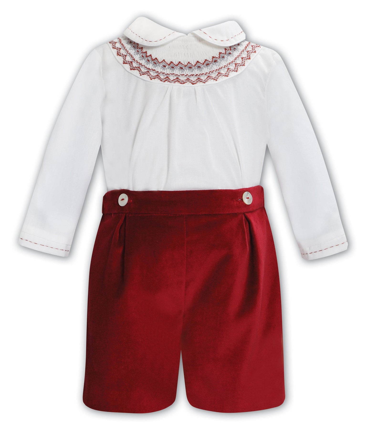 Boys Two Piece Hand Smocked Shirt & Velvet Shorts Set - Ivory & Burgundy - 013431