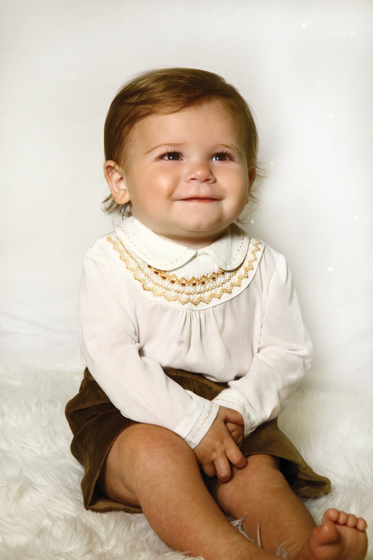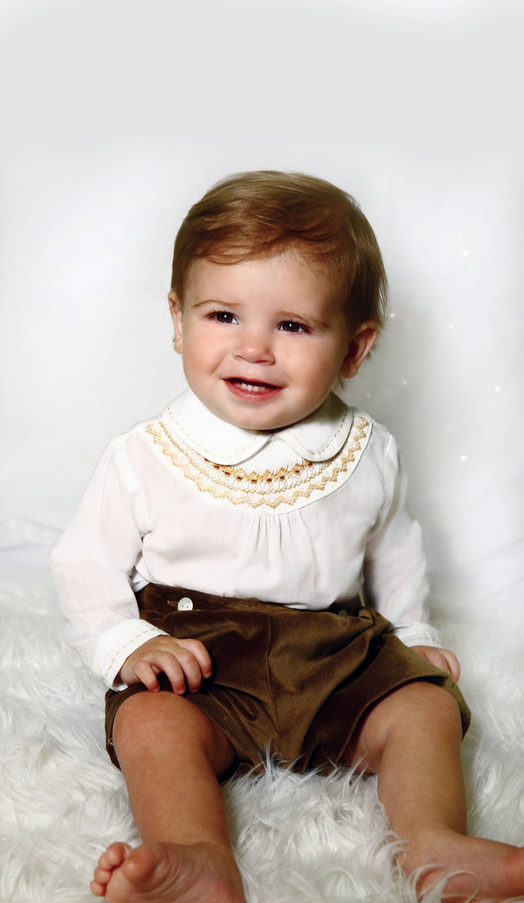 Fit for a prince! Our charming 2-Piece boys’ set is the perfect ensemble for any special occasion. This elegant outfit features soft velvet shorts, buttoned at the waist for a secure fit. The set is completed with an ivory hand-smocked shirt, adorned with a classic Peter Pan collar. Make your little one shine in this sophisticated and stylish attire.