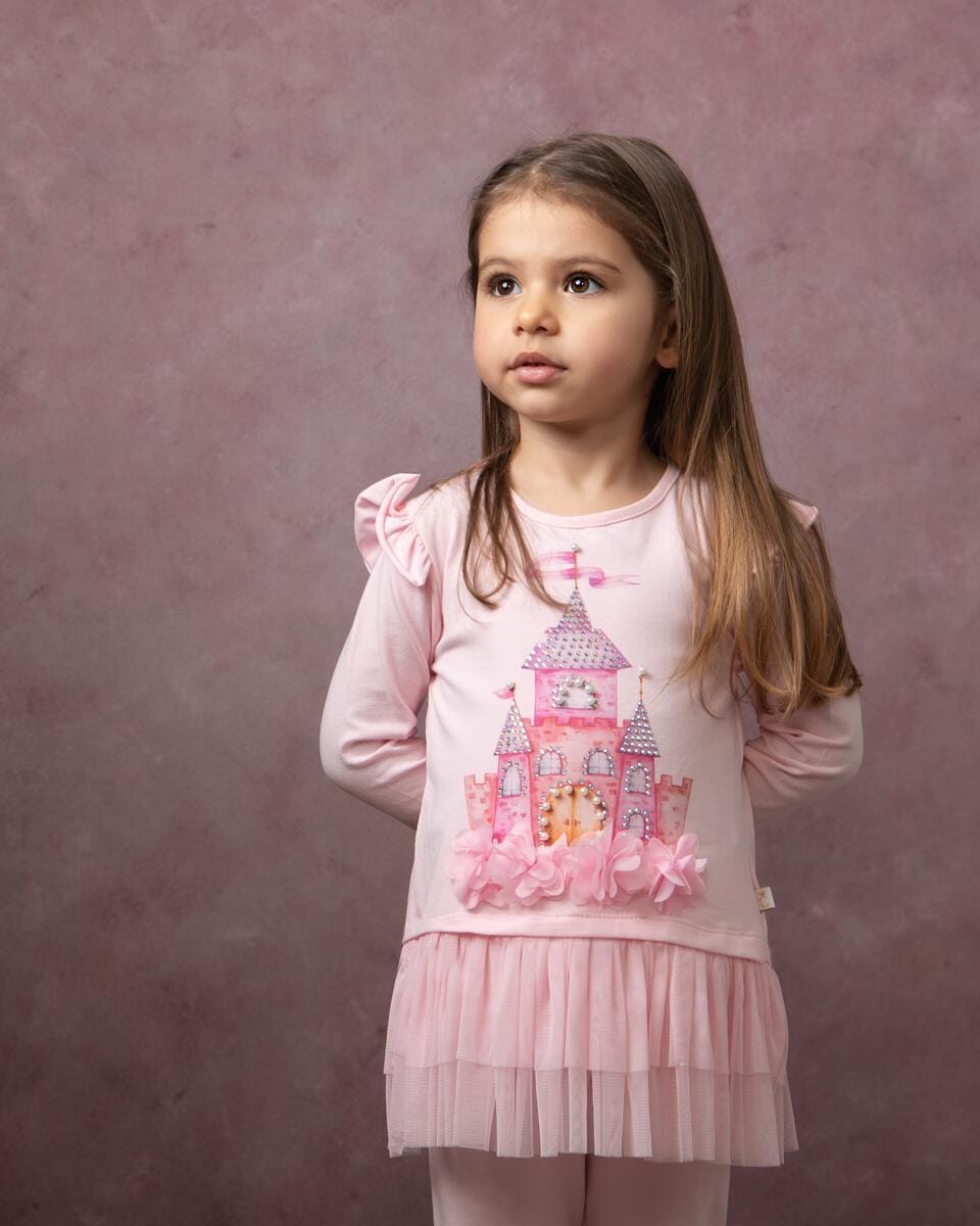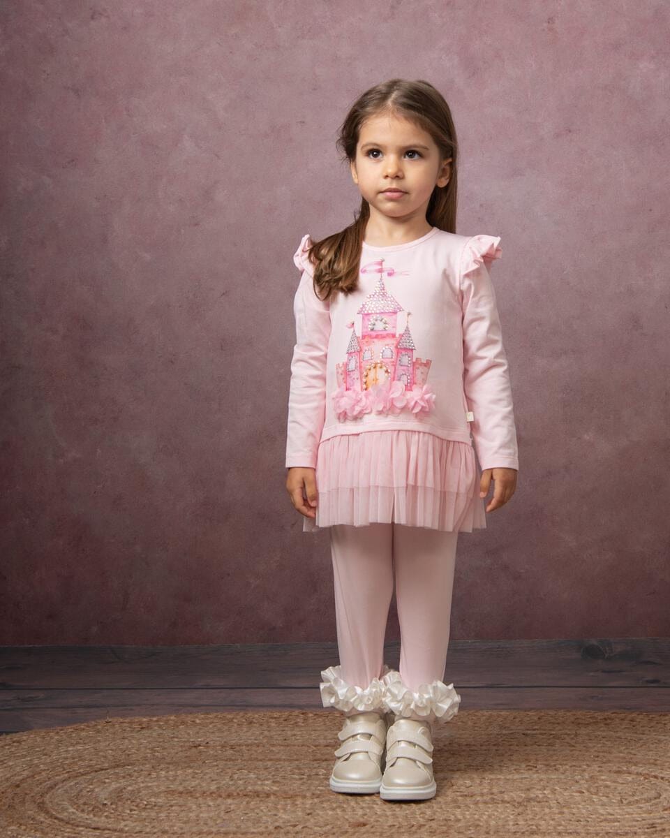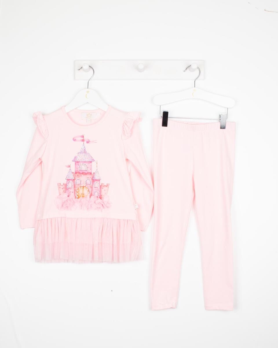 Caramelo Kids leggings set is perfect for any little princess. Its pink color and diamante castle side details make it both stylish and comfortable. Perfect for casual playdates and special occasions alike.