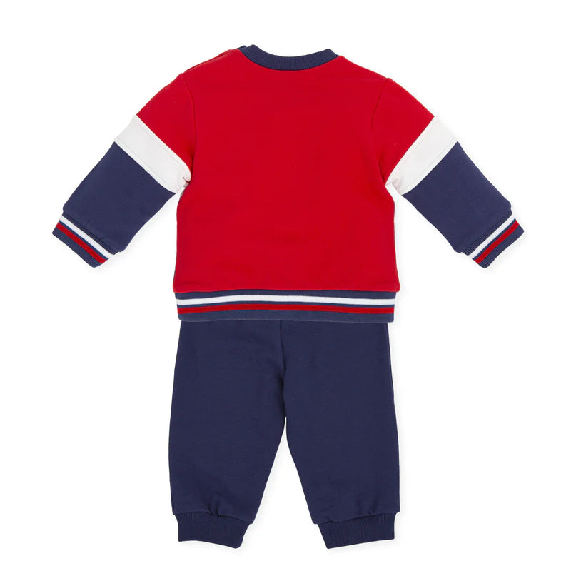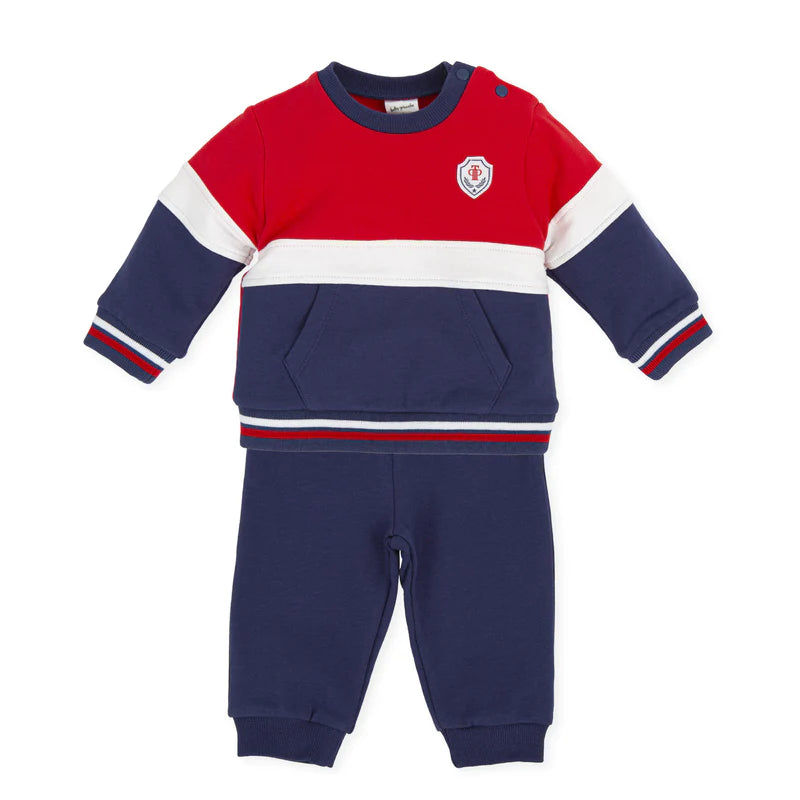 Jersey cotton set with elastane in navy combined with red and white. Ribbed collar, cuffs and hem. Pocket detail. Shoulder opening with poppers. trousers with soft elastic at the waist and cuffs at the bottom.