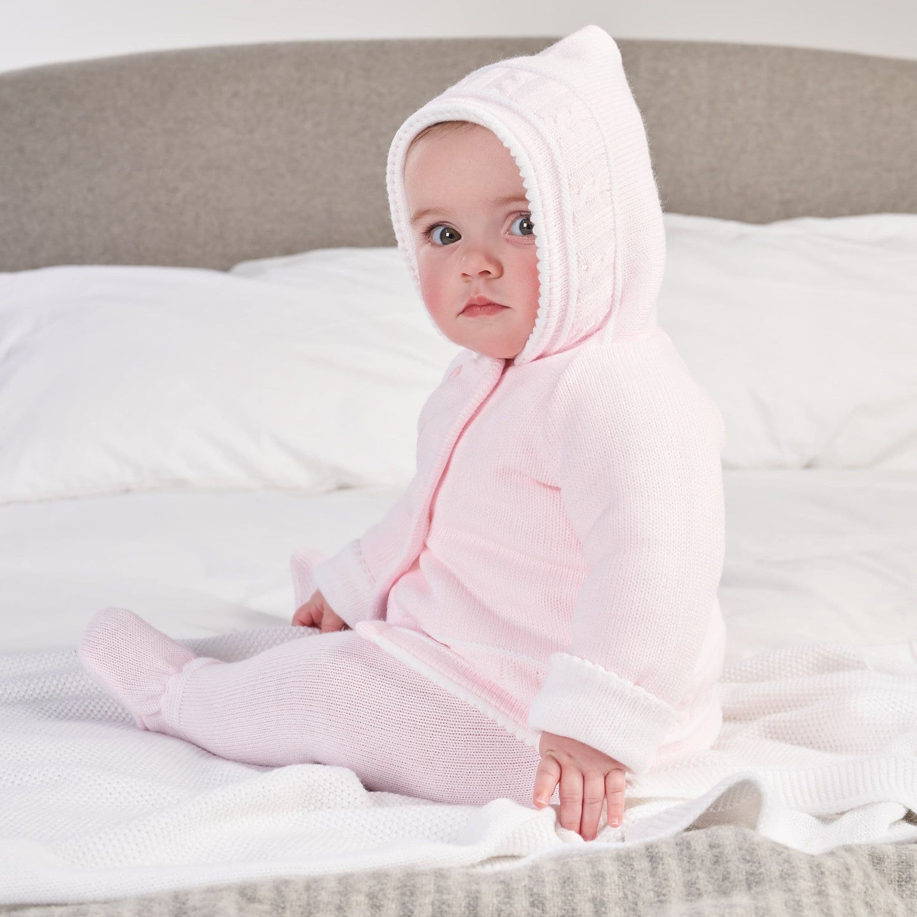 A adorable new pink and white baby knitted jackets. Knitted baby jacket with cute hooded and white trim detailing.