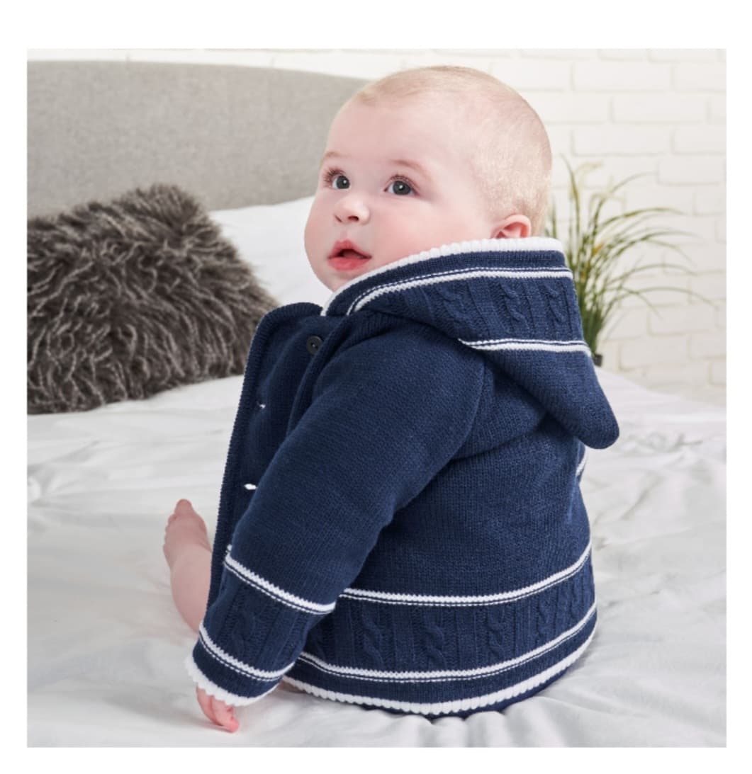 A adorable new navy and white baby knitted jackets. Knitted baby jacket with cute hooded and white trim detailing.