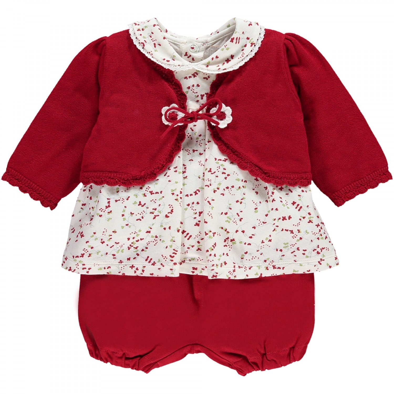 Discover the exquisite craftsmanship of the Emile et Rose Three Piece Set. Enjoy the feel of the soft cotton blouse and cardigan, perfect for keeping your precious little one comfortable. Delight in the adorable matching bloomers, designed to last through countless washes. Invest in the luxury of your baby's first wardrobe.