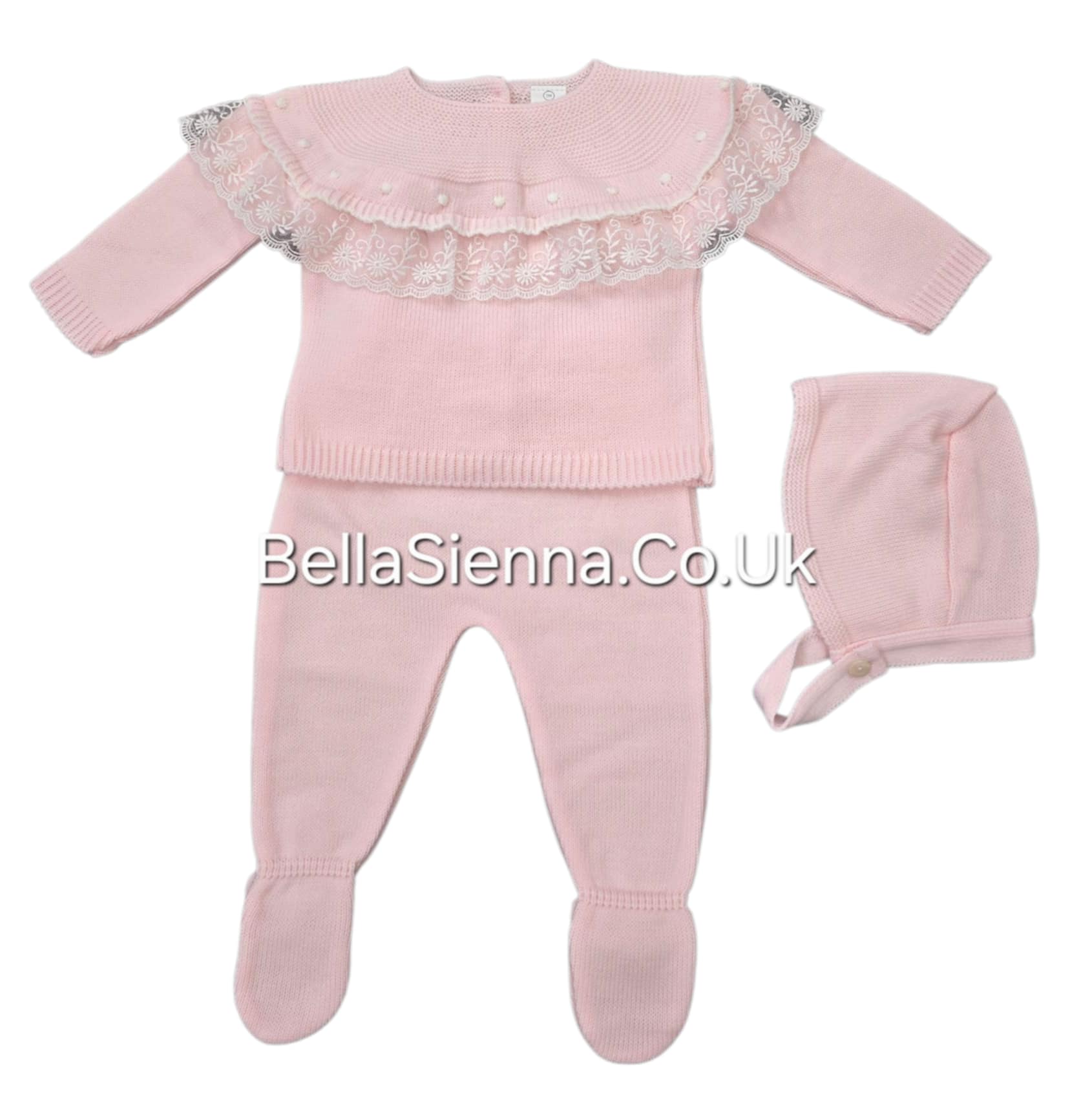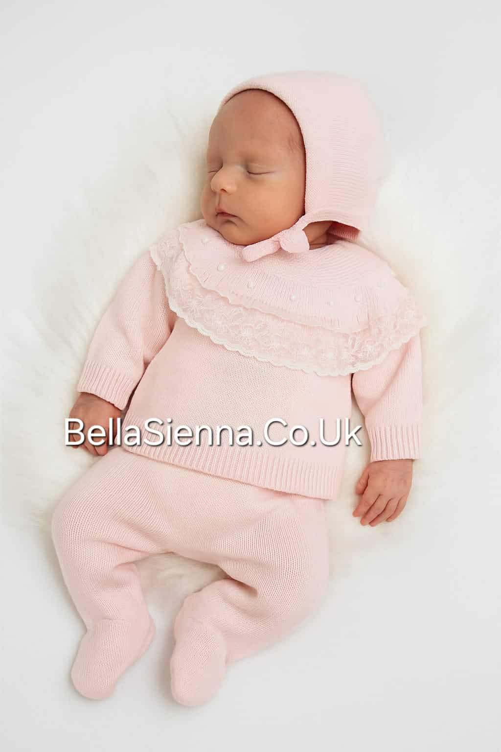 Girls Pink Lace Three Piece Knitted Set With Bonnet - C7019R