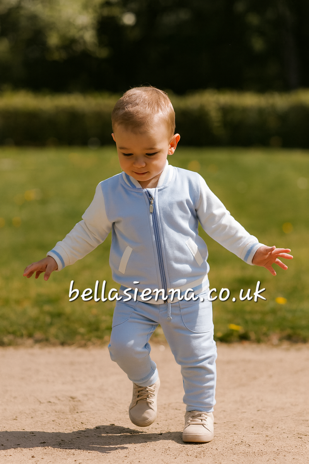 GYMP boys pale blue tracksuit made in soft stretchy jersey material with a blue stitched lettering to the front.