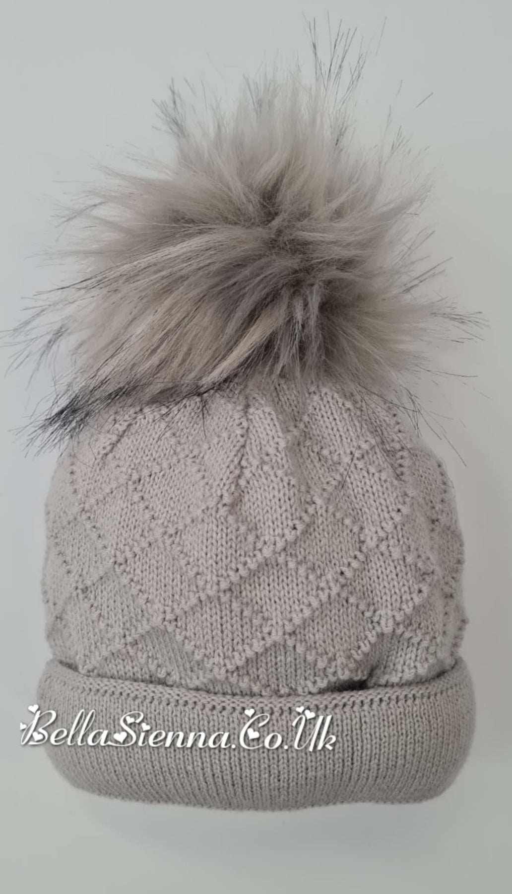 Children’s classic style pom-pom hat from Portuguese brand; Little Nosh. Featuring a diamond ribbed knit with a turn-up hem. Finished with a fully lined inner for extra warmth & decorated with a large faux fur single pom.