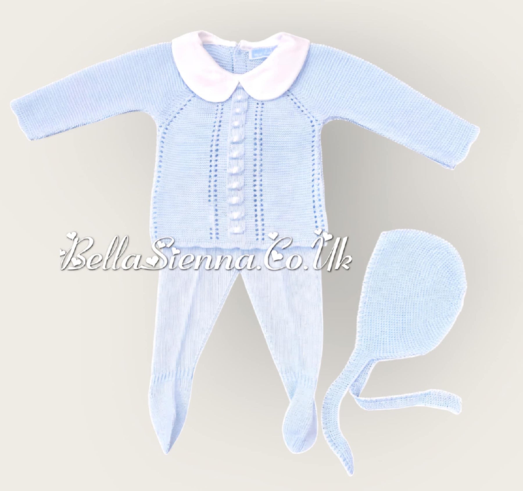 9611G BABY THREE-PIECE OUTFIT INCLUDES COTTON KNITTED SWEATER WITH COTTON PETER PAN COLLAR WITH LEGGINGS AND BONNET