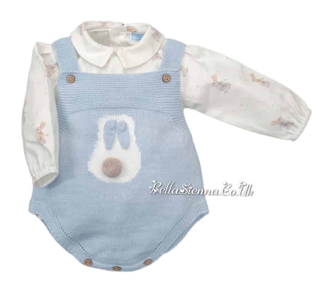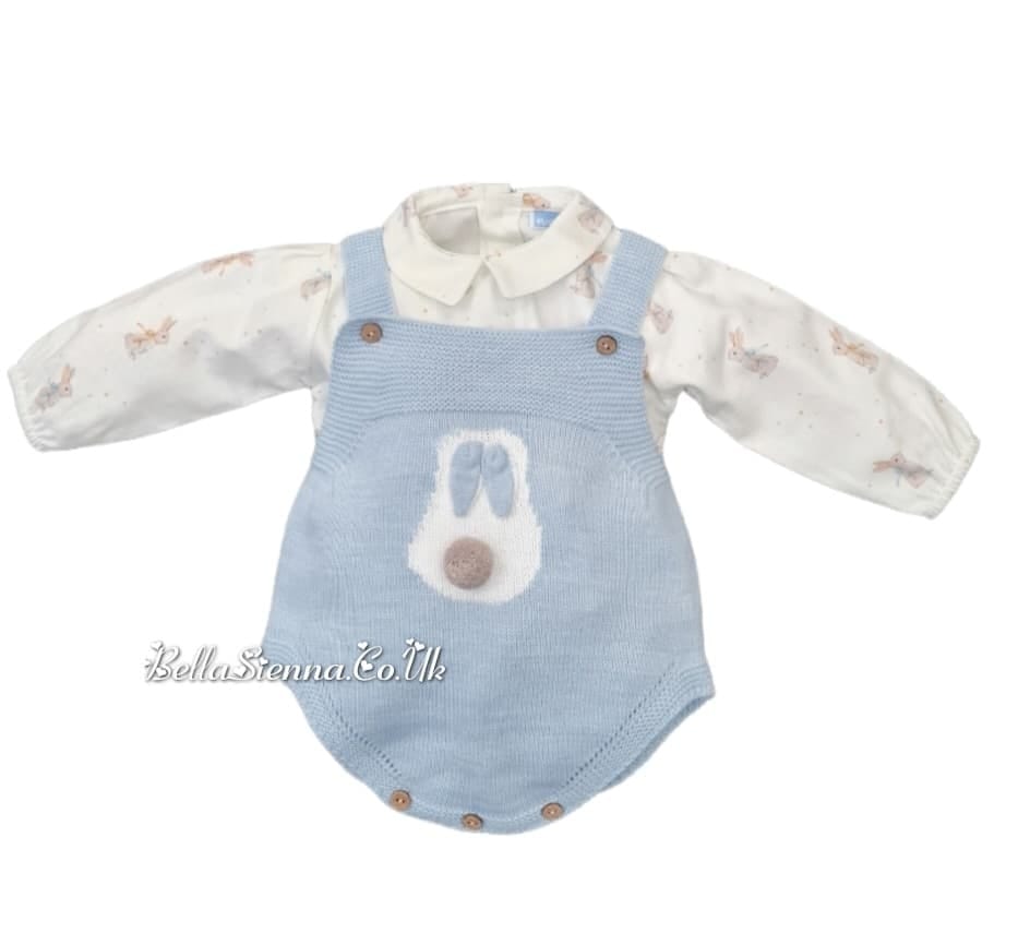 Baby boys pale blue dungarees and top set by Mac ilusion, knitted in a soft, lightweight cotton blend. The pale blue dungarees have a lovely knitted rabbit design, and little wooden button fastenings. The cotton top has a collar and cute little rabbit print button fastenings on the back.