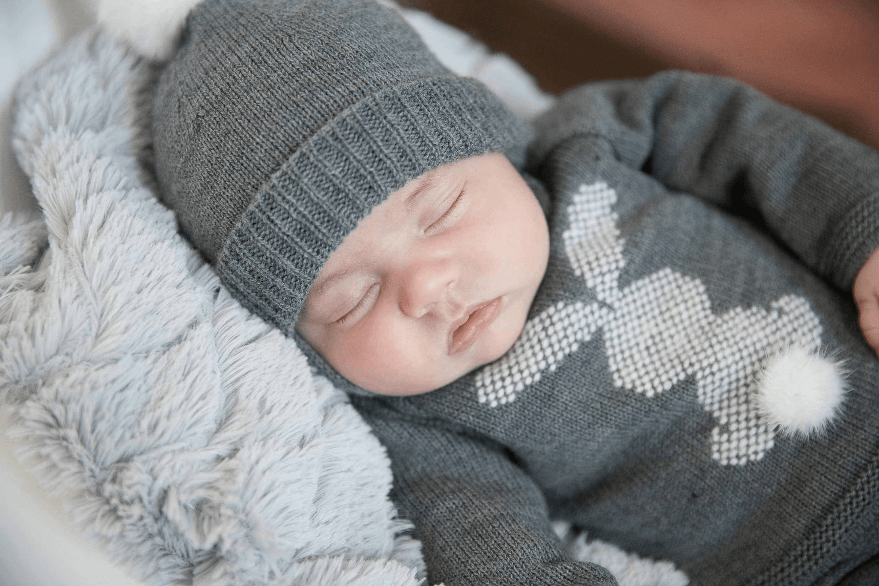Mac Ilusion collection - soft knitted three piece set knitted long sleeve tunic in grey and white, pearl buttons up the entire back for easy dressing, feet in leggings with gently elasticated waistband and a sweet little pon pom hat that ties under the chin - presented in gift box. Made in Spain - perfect for Baby Showers.