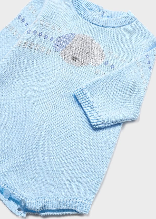ECOFRIENDS garment 100% sustainable cotton. Long sleeved romper for newborn. Snap button fastening at crotch for easy dressing. Button fastenings down the back to allow the garment to be put on and taken off easily.