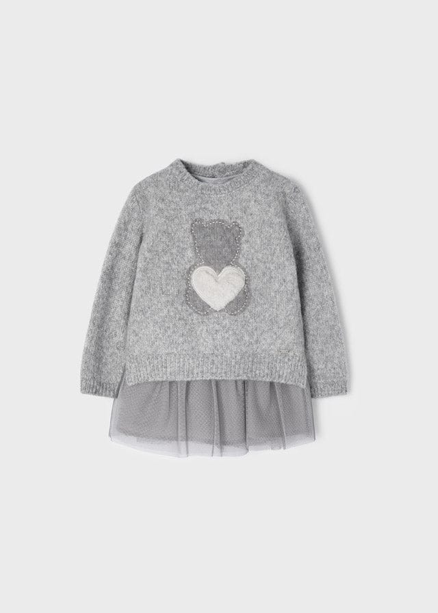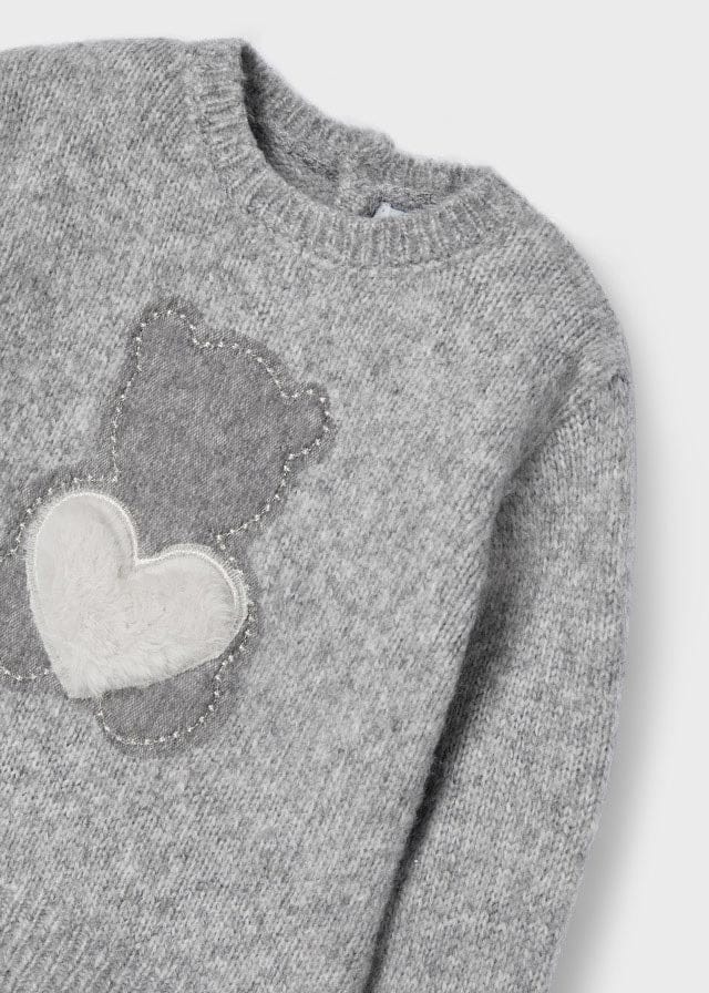Long sleeved jumper for baby. Small opening on the back with a button fastening to allow the garment to be put on easily.
