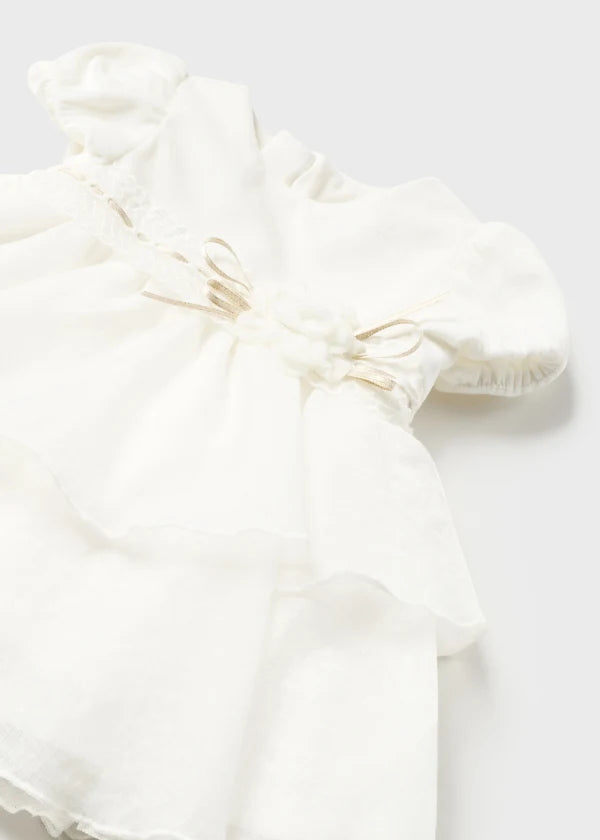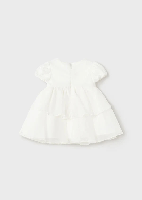 This Mayoral Newborn chiffon dress is a perfect addition to your little one's wardrobe. It is exquisitely crafted from a combination of soft velvet and delicate chiffon, and features a zip fastening for ease and convenience. This is a timeless piece that is perfect for any special occasion.