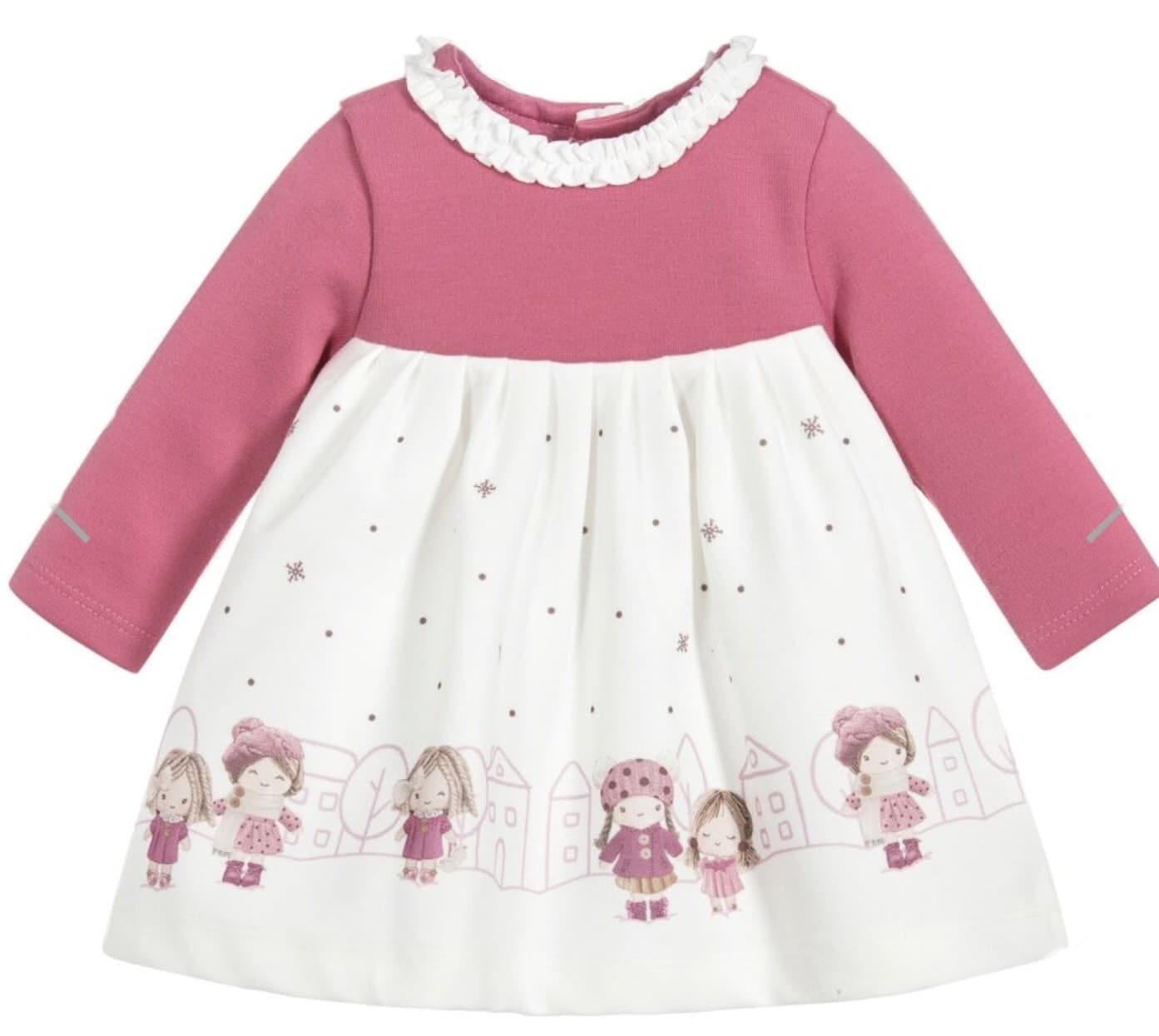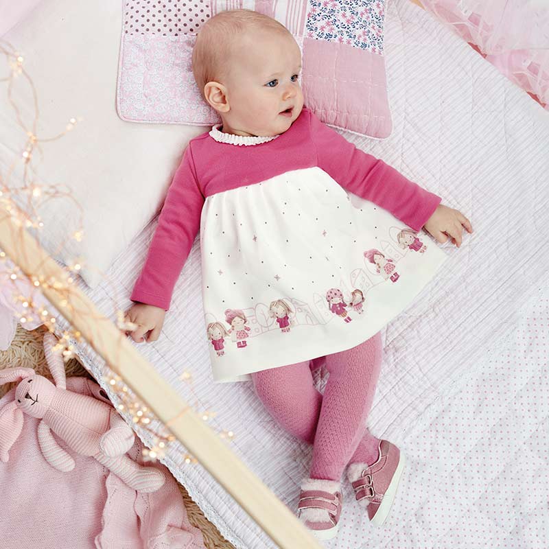 Adorable deep pink and ivory dress for little girls by Mayoral. Made in soft and sustainable cotton jersey, this casual dress has a sweet village print.