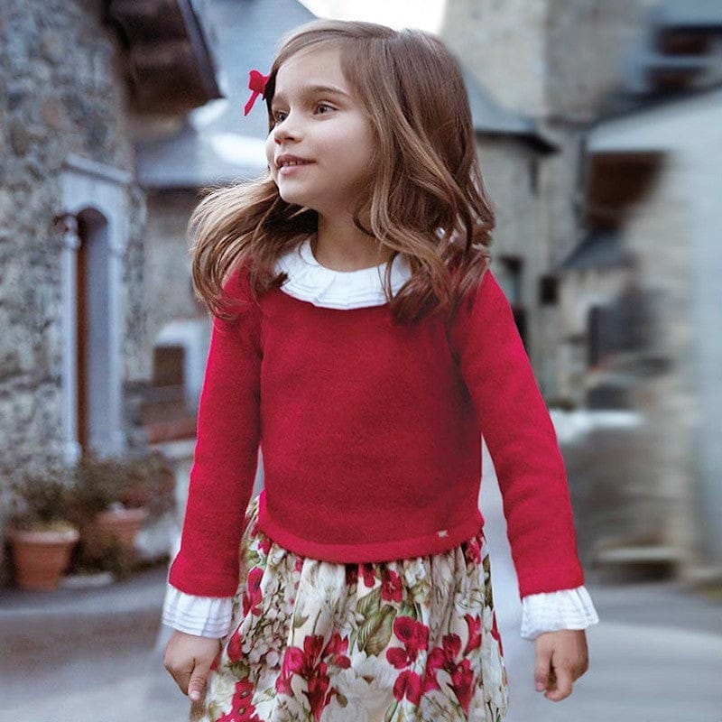 This gorgeously designed Mayoral dress features a vibrant red floral print on a soft and lightweight cotton fabric. Perfect for adding a splash of color to any occasion! The ruffle neck design is comfortable and provides a classic look for any season.