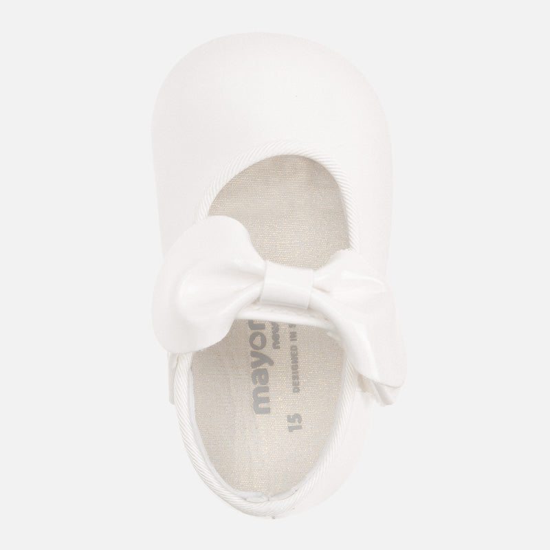 Adorable white patent pre-walker shoes for baby girls, by Mayoral Newborn, they have a pretty white bow on the front, and a velcro fastening strap across the front for easy dressing.