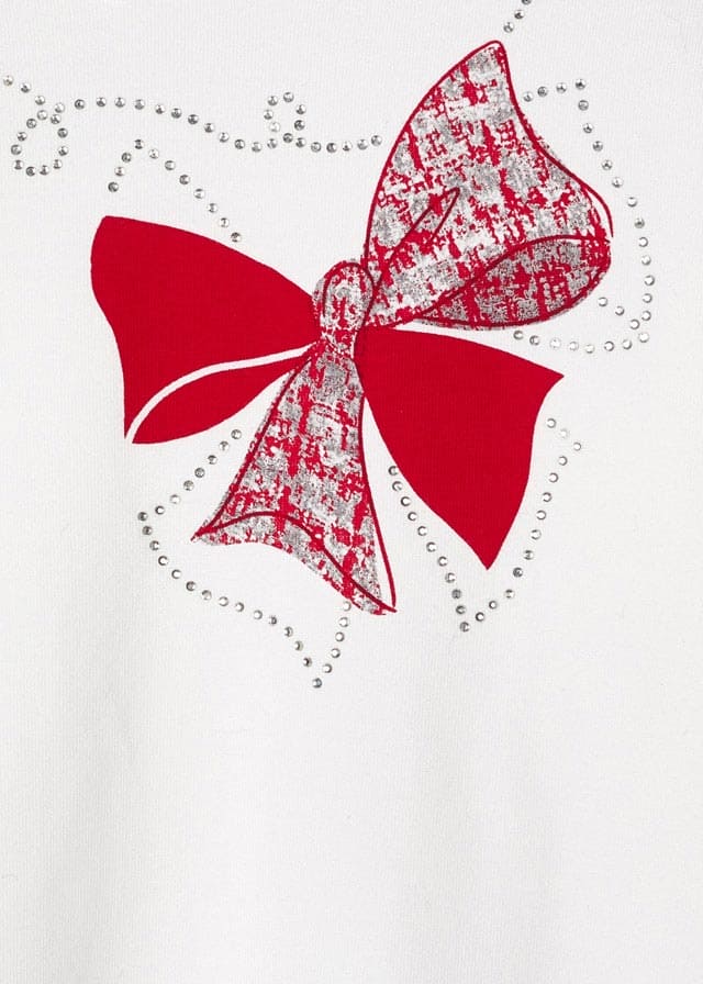 Mayoral wool skirt and top set, perfect for every young girl. The set includes a long-sleeved top with a round neckline and a bow applique. The skirt features an adjustable elastic waistband and luxurious metallic fiber.