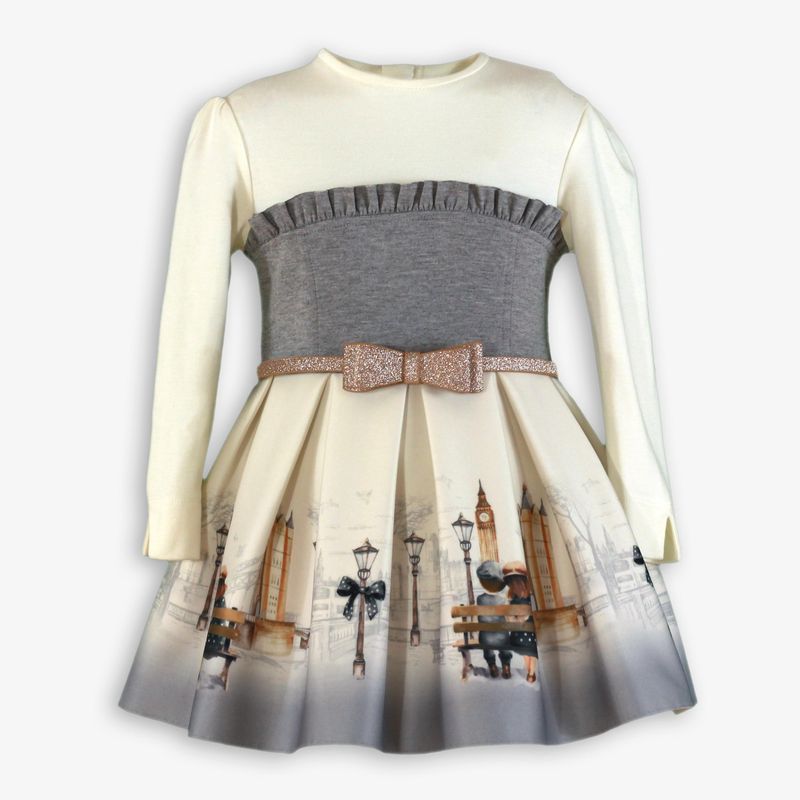 Miranda Girls Cream & Grey "London Scene" Dress With Gold Glitter Belt - 236V
