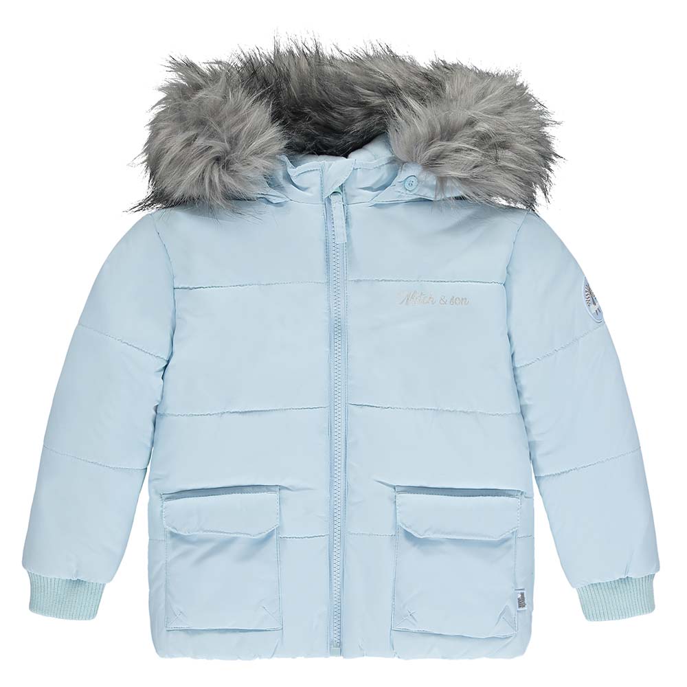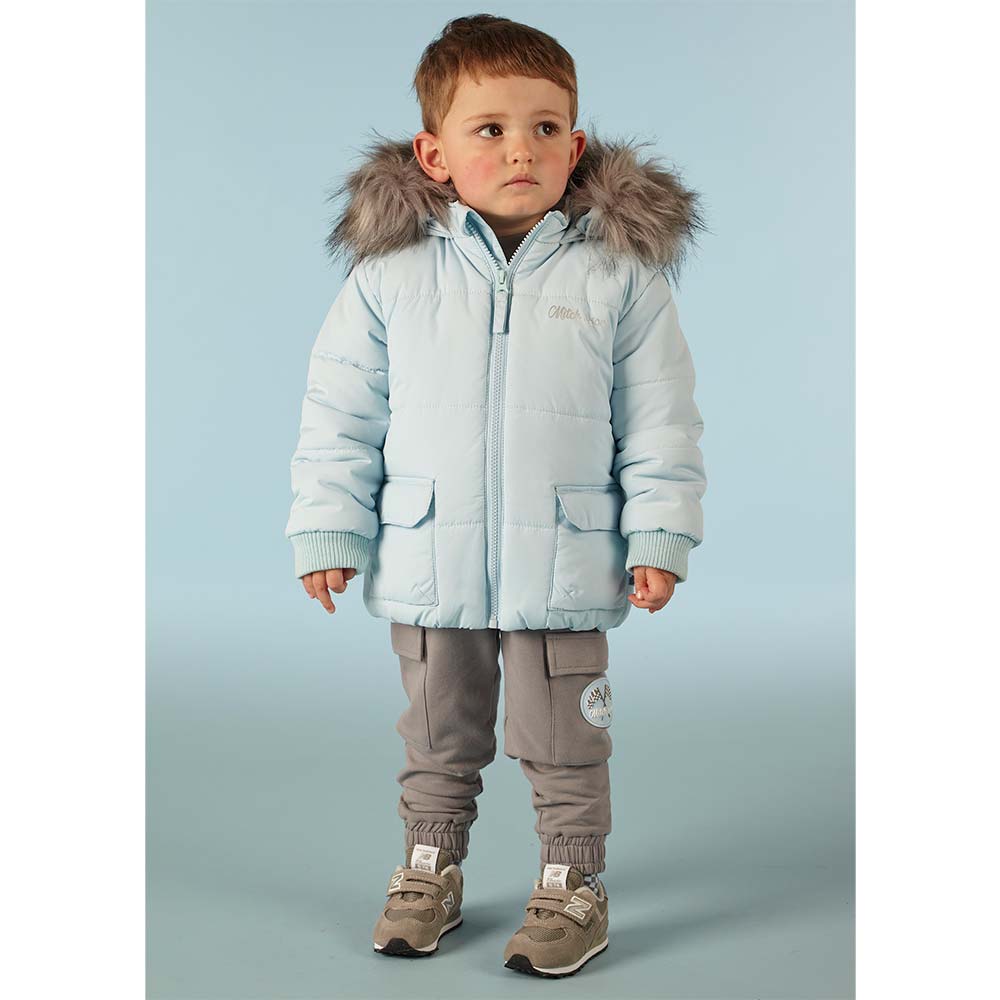 Our Mitch & Son faux fur hooded puffer jacket coat is an exquisite piece of outerwear that will keep your loved one protected in style. Its pale blue and grey colour this coat adds a touch of elegance to any look. Keep him warm and cosy while he stands out and shines!