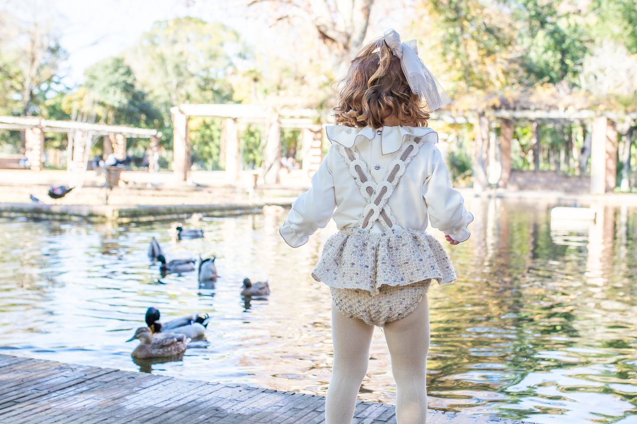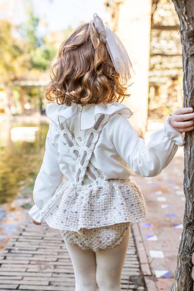 Naxos Baby Girls beige Tweed Romper Set, a truly adorable piece that elevates your little one's wardrobe. Handmade in Spain.