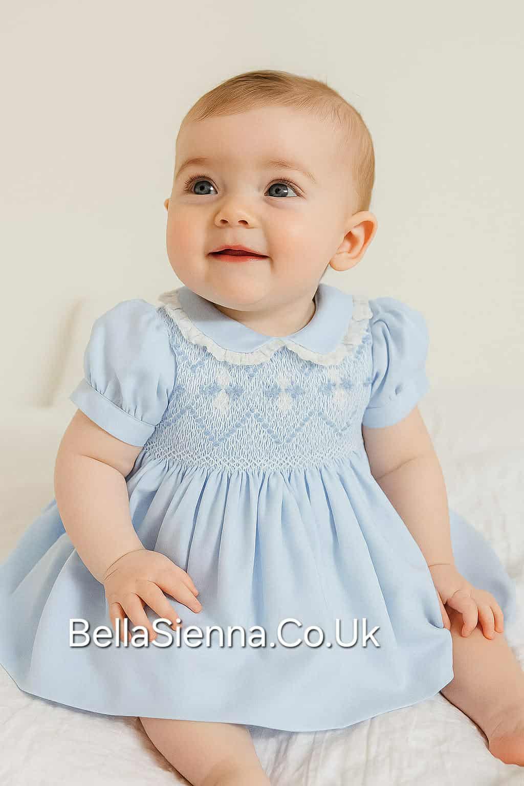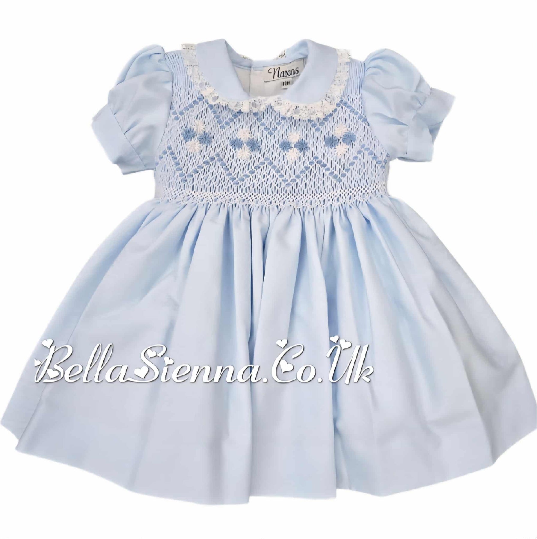 The Naxos Girls Blue Smocked Dress features a beautifully smocked chest that adds elegant texture and detail. Its delicate lace-edged collar enhances the dress with a soft, refined touch, while the puffed sleeves provide a classic silhouette. Designed to combine a timeless style, this dress is perfect for special occasions.
