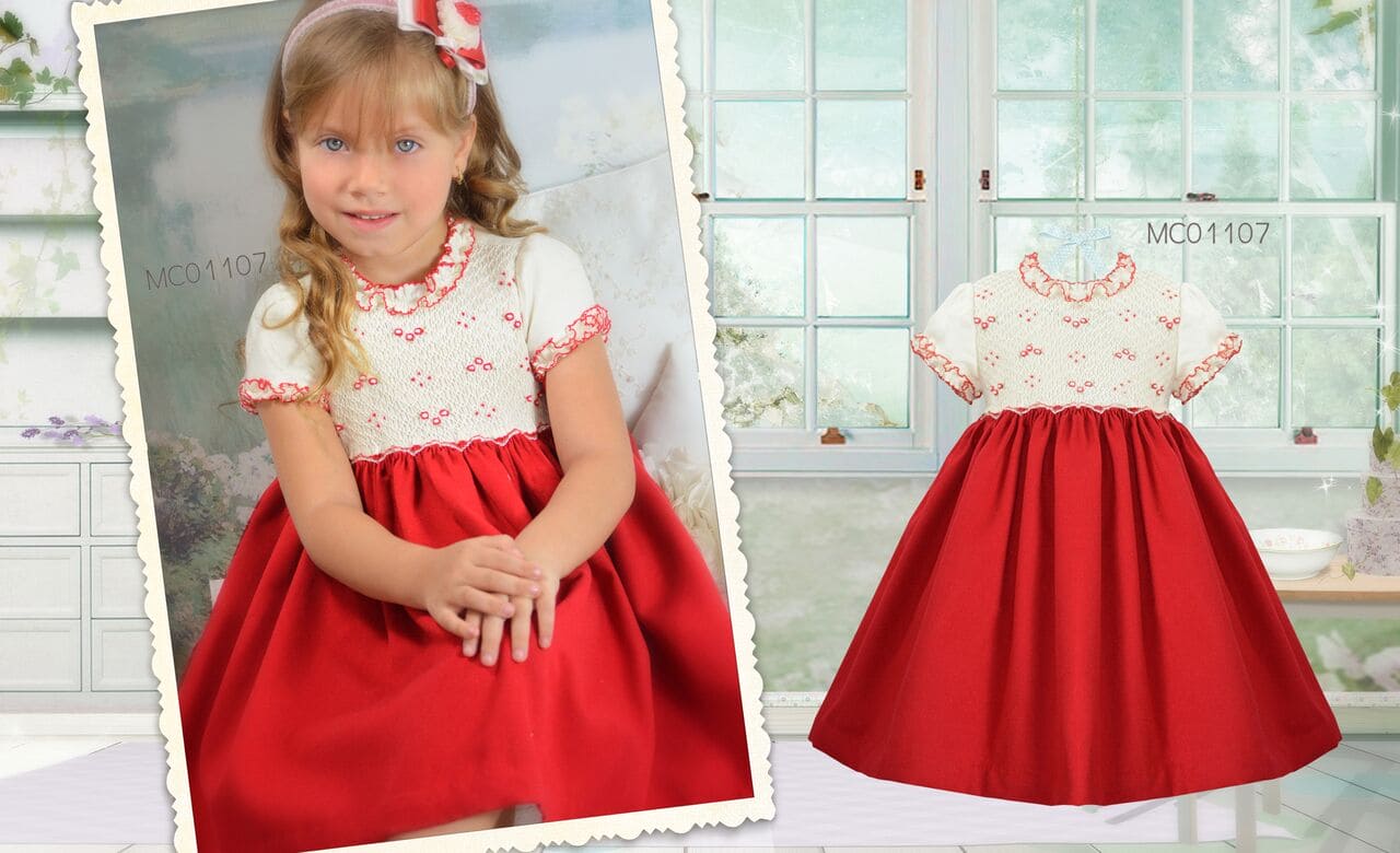 A traditional dress and headband for girls by Pretty Originals. The red dress has a cream smocked bodice with red embroidery  to the waistline. It has a delicate red with cream lace-edged lining, with a button fastening at the back and a sash that ties in a large bow.