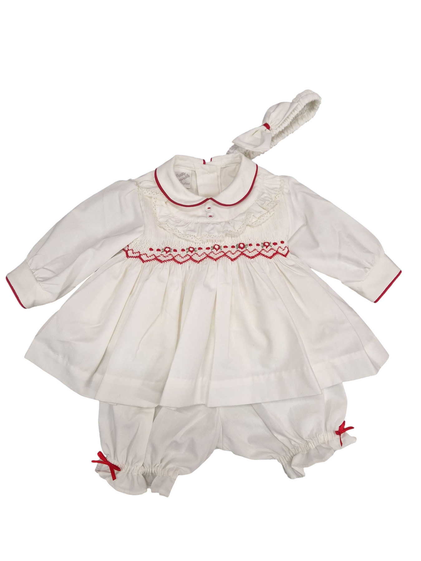 Pretty Originals Girls Ivory & Red Hand Smocked Dress, Bloomers & Headband Set - MT02472