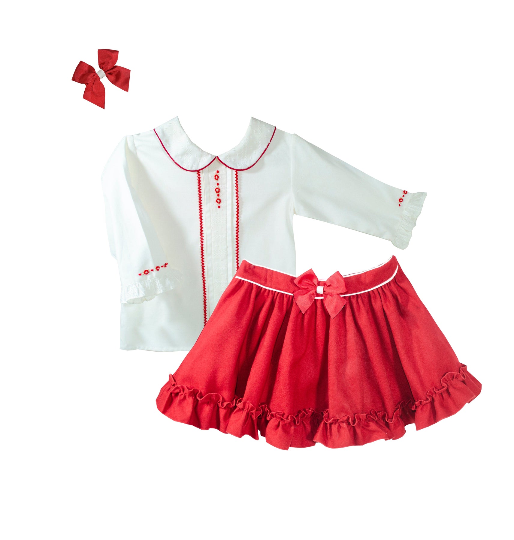 A delightful red and ivory skirt set for girls by British brand, Pretty Originals. Made from a cotton twill, the stunning button back blouse has a Peter Pan collar, the frilled cuffs, and centre pleated panel with embroidery. It is beautifully hand-embroidered with pretty flowers. Fully lined, the skirt has a pretty frilled hemline and ivory piping on the waist. The red grosgrain ribbon bow on the front matches the hair clip for a coordinated look.