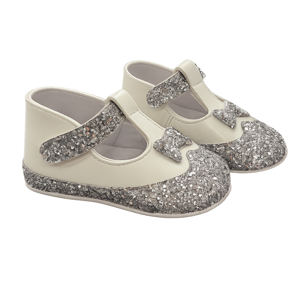 Pretty Originals White Patent & Silver Glitter Leather Pram Shoes - UE03301
