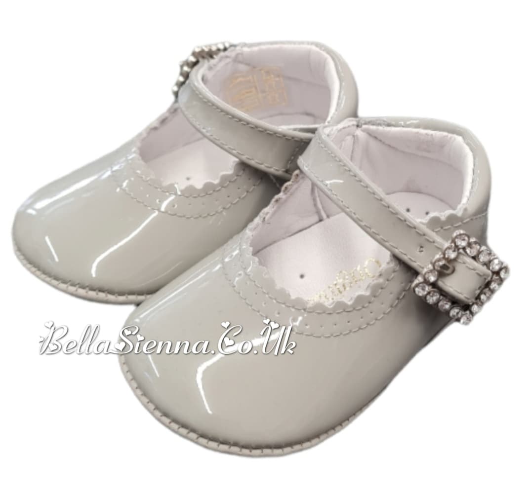 Pretty Originals Grey Patent Leather Pram Shoes With Diamate Buckle - UE02191A