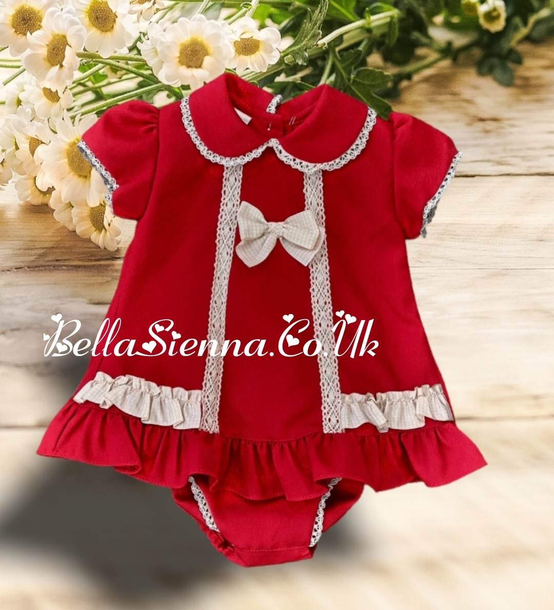 Lovely Red dress set for little girls by British brand Pretty Originals. Soft, mid-weight dress has puffed sleeves and pretty peter pan collar. It is trimmed with a delicate ivory lace and pretty bows. Fully lined for comfort, it fastens on the back with buttons. The dress comes with matching knickers that have a gently elasticated back and a pretty headband to complete the look.