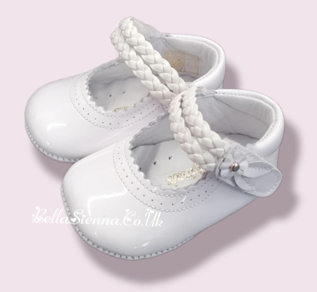 Pretty Originals White Patent Leather Pram Shoes With With Plaited Flower Strap - UE02663
