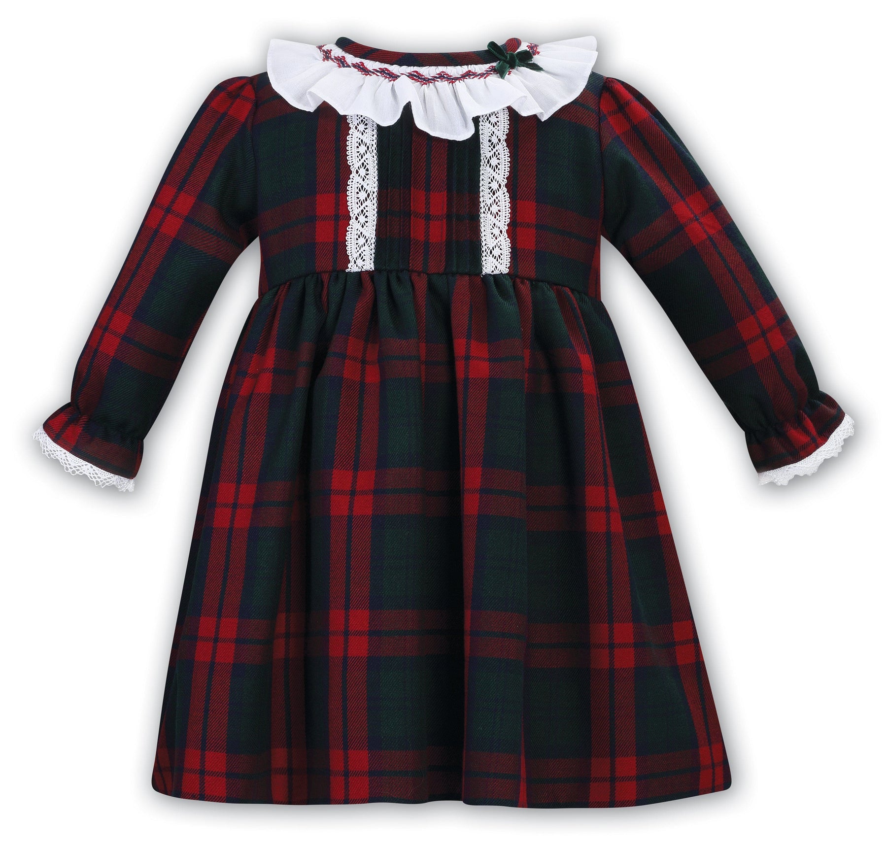 Sarah Louise red, green and blue dress for little girls , in a soft twill weave. This dress has a tartan check pattern, lace trims. The white smocked ruffle collar has an embroidered zig-zag pattern and a green velvet bow on the neckline. There are button fastenings on the back and soft lining for comfort.