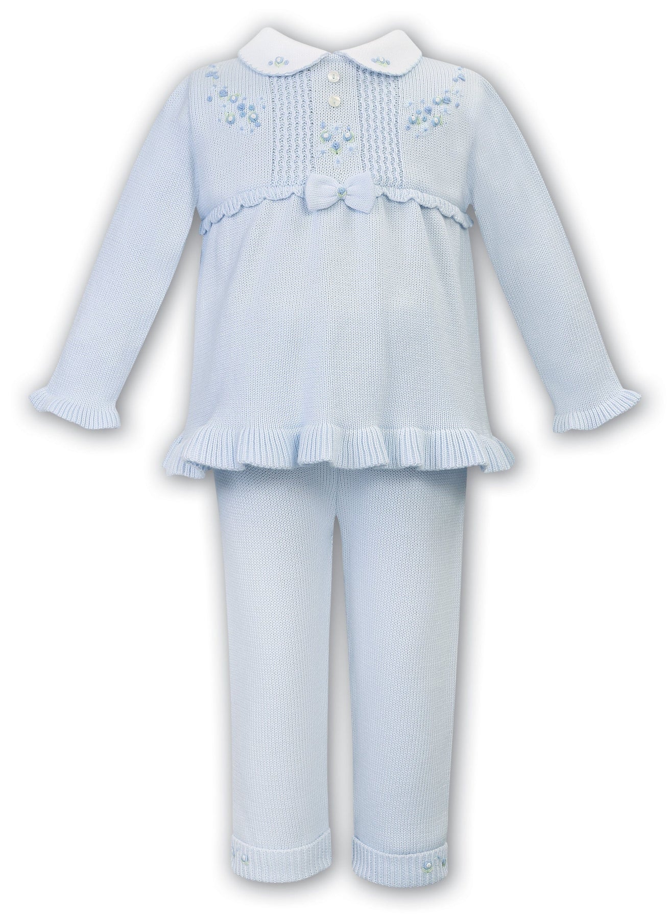 Baby blue legging set for little girls by Sarah Louise, knitted in soft cotton with hand-embroidered flowers. The top has a white collar, pretty stitching details, with a bow, decorative buttons and fluted ribbed trims. The knitted trousers have an elasticated waist and turn-up cuffs with matching embroidery.