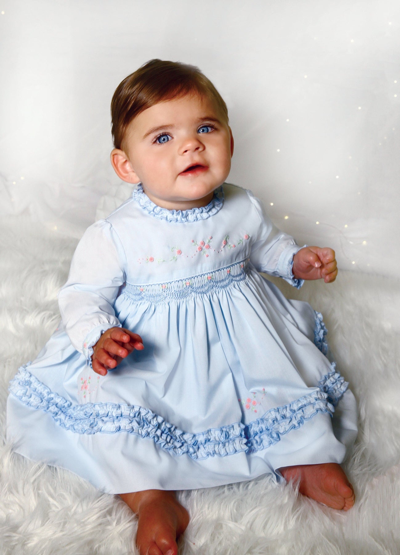 Introducing the sweetest addition to your girl’s wardrobe. This dress features delicate ruffles along the neckline and hem, adding a touch of elegance. The front is beautifully hand-smocked and adorned with tiny pink flowers, complemented by delicate embroidered flowers on each cuff. Fully lined, it fastens at the back with dainty pearlescent buttons, making it both adorable and practical.