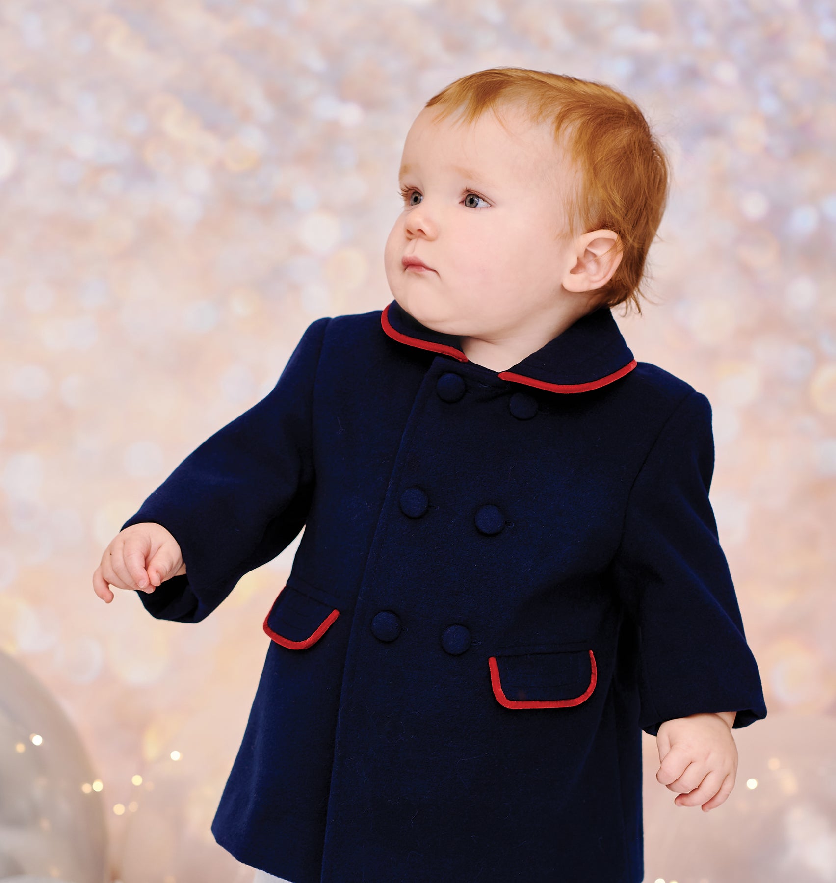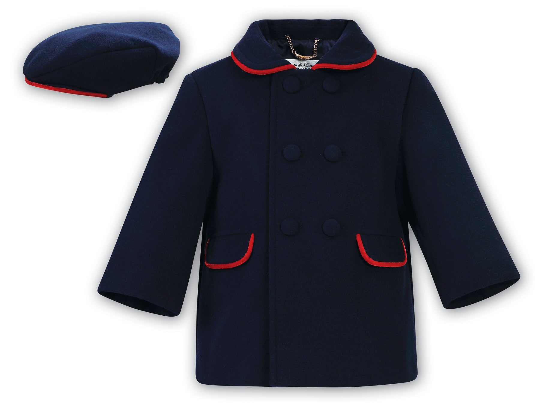 Traditional style coat from British brand Sarah Louise for boys. A double breasted, knee-length coat in a luxurious brushed felt like material with peter pan collar and pockets trimmed in red velvet piping, fully lined in a navy silk like material. Paired with a matching traditional flat cap with elastic for comfort.
