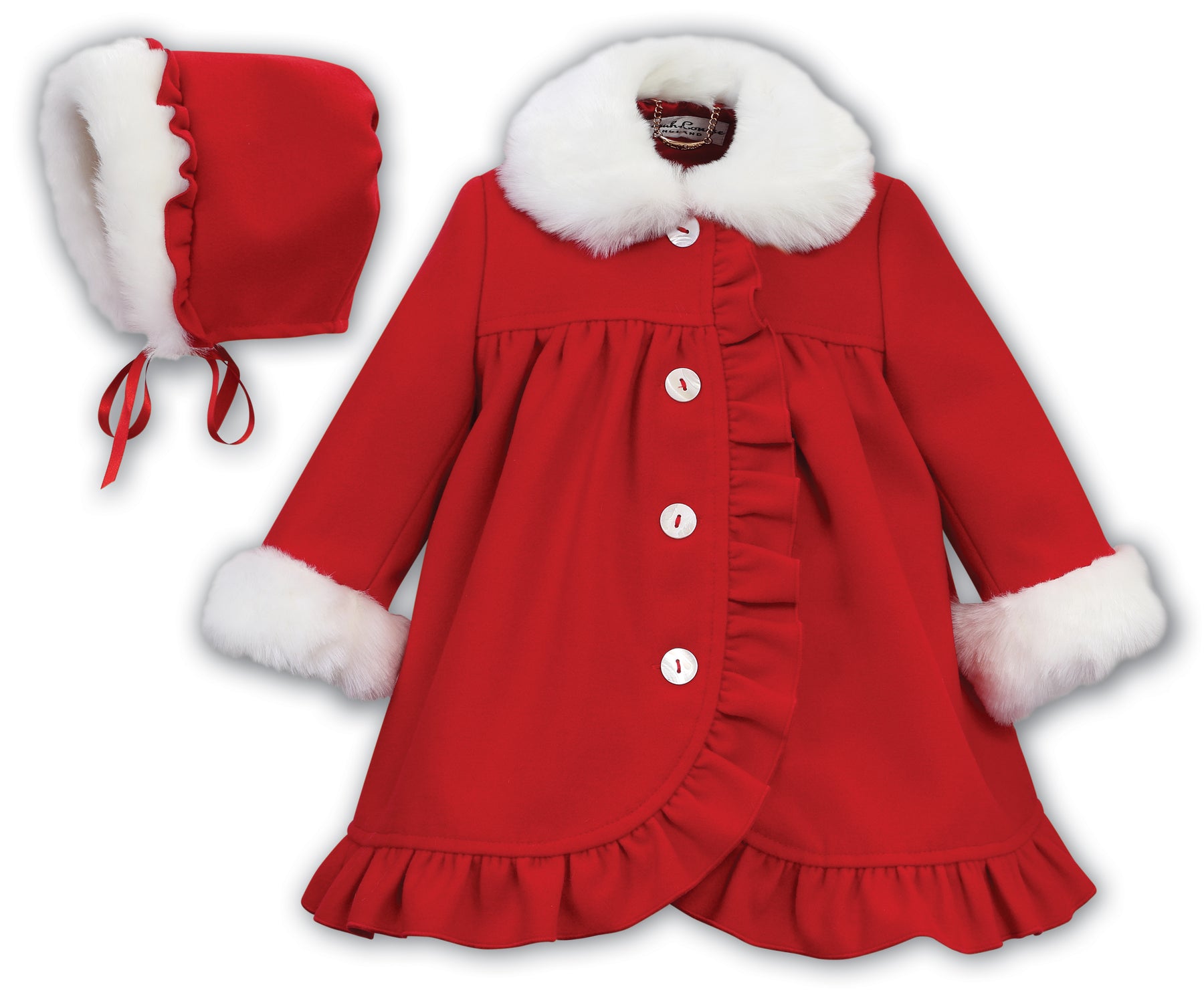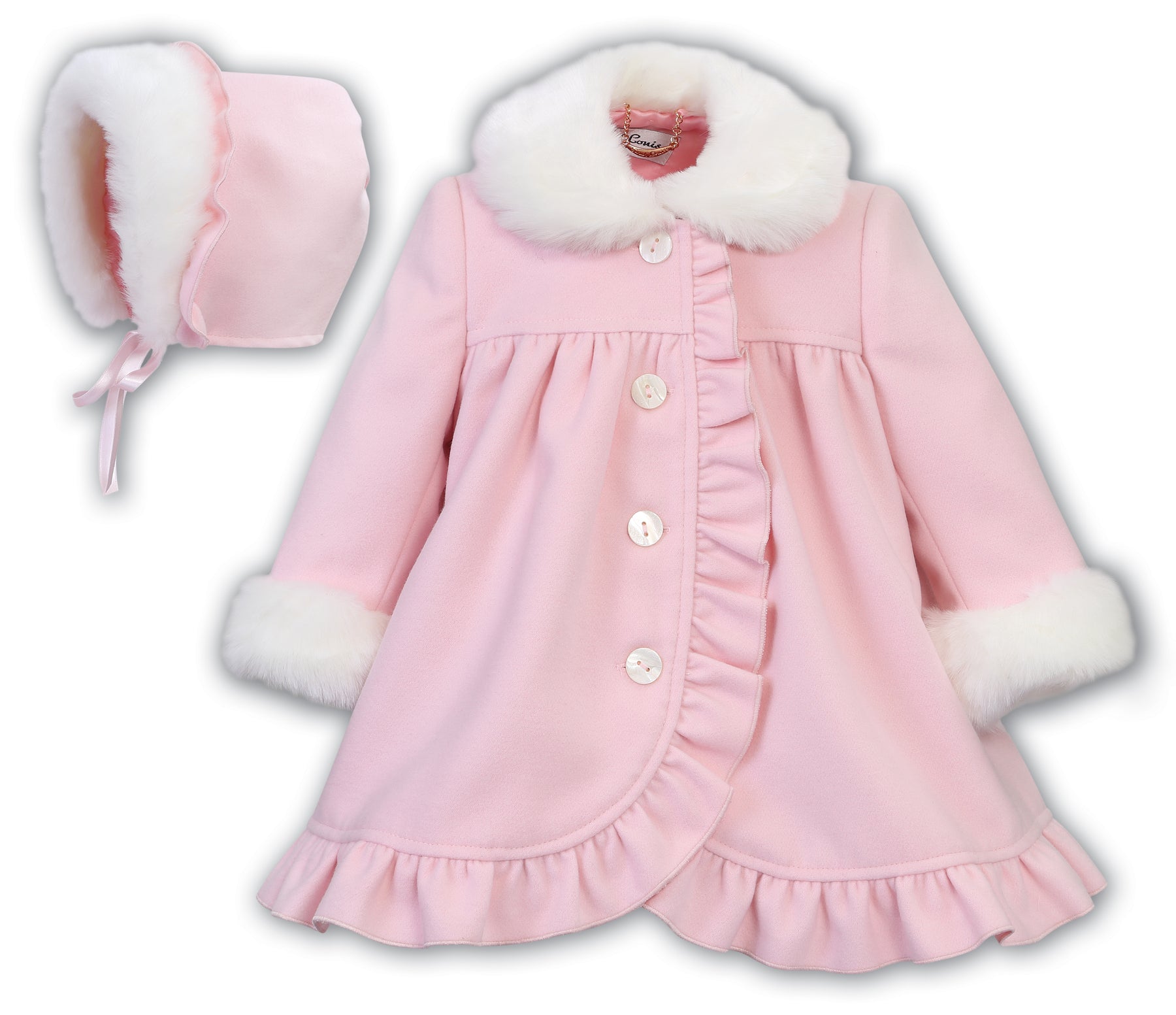 A lovely pale pink and ivory coat set for little girls by British designer Sarah Louise, lined with silky satin. This traditional design is made in a beautifully soft, brushed viscose blend with button fastening, pretty faux fur trims. It is gathered and pleated on the front and back. A sweet pink and ivory bonnet that completes this timeless set.