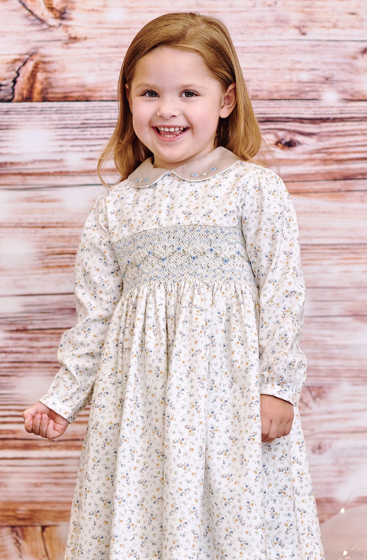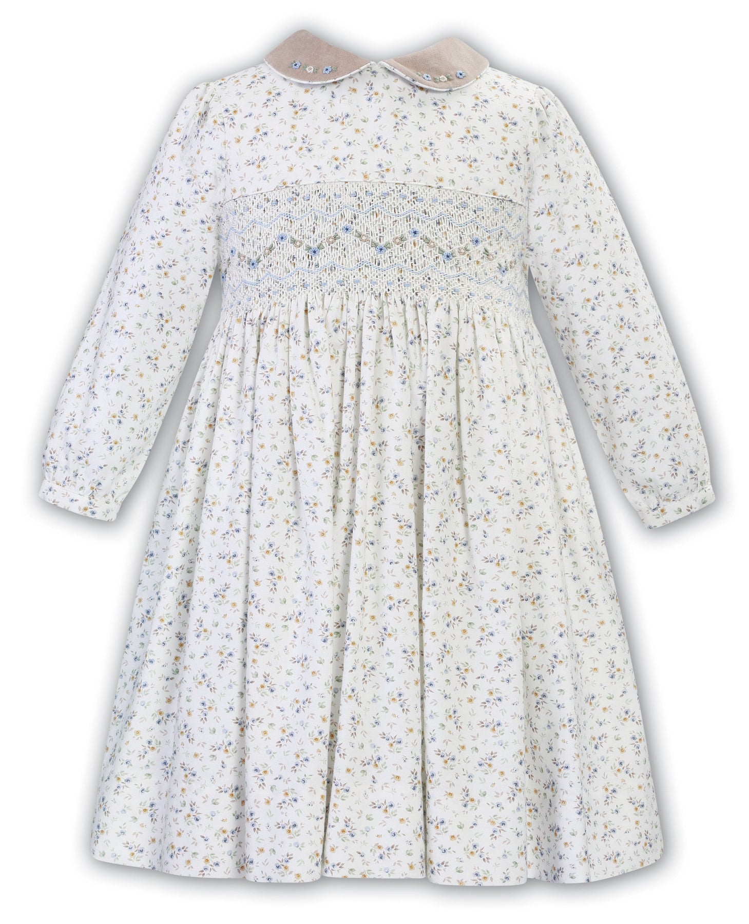 Sarah Louise Ivory & Beige Floral Print Hand Smocked Dress - 013112