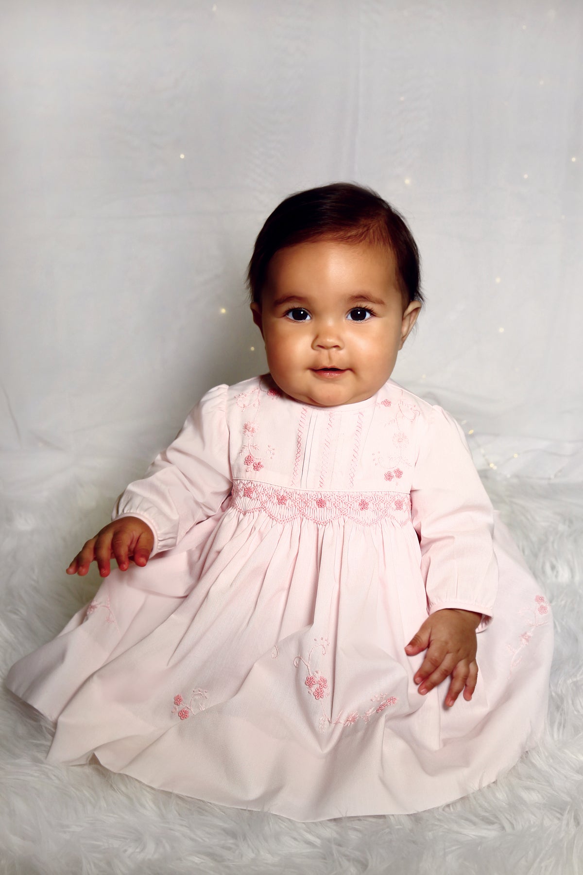 Our baby girl’s dress and bonnet ensemble features’ a delicate hand-smocked detailing and intricate hand-embroidered motifs, showcasing exquisite craftsmanship.