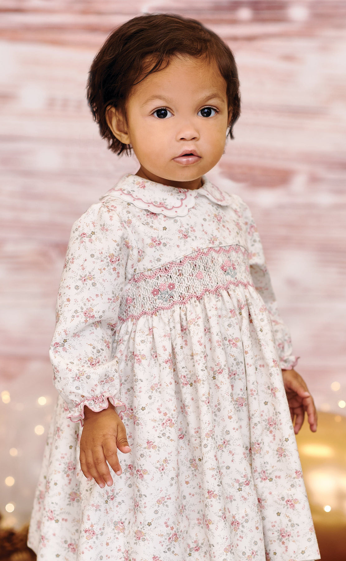 Sarah Louise Ivory & Pink Floral Hand Smocked Dress 013063