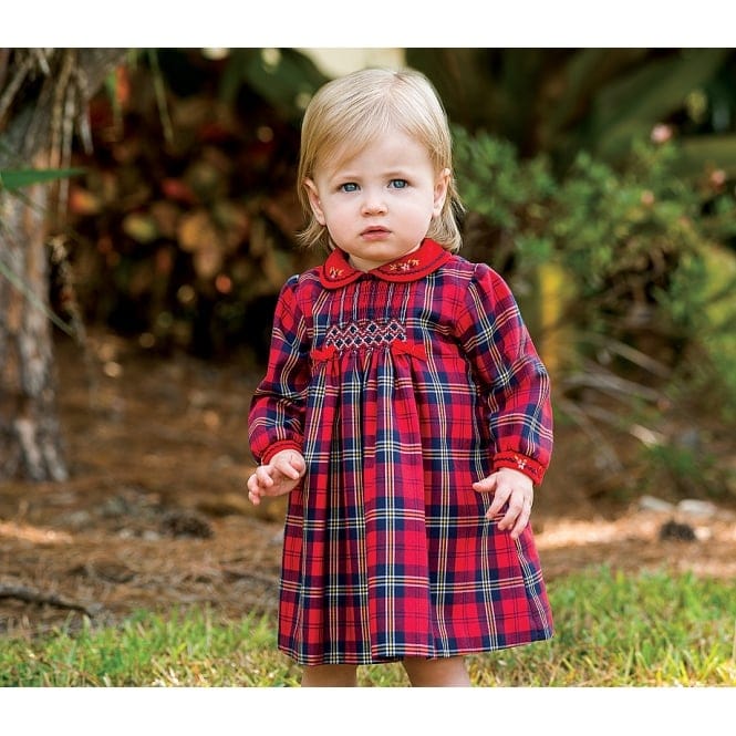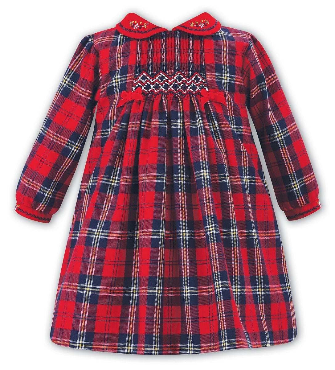 The perfect dress for Christmas from Sarah Louise for girls. A beautiful, traditional tartan dress fully-lined with decorative red velvet bows smocking to the chest, red peter pan collar with pretty embroidered flowers and navy stitching hidden zip fastening to the back.