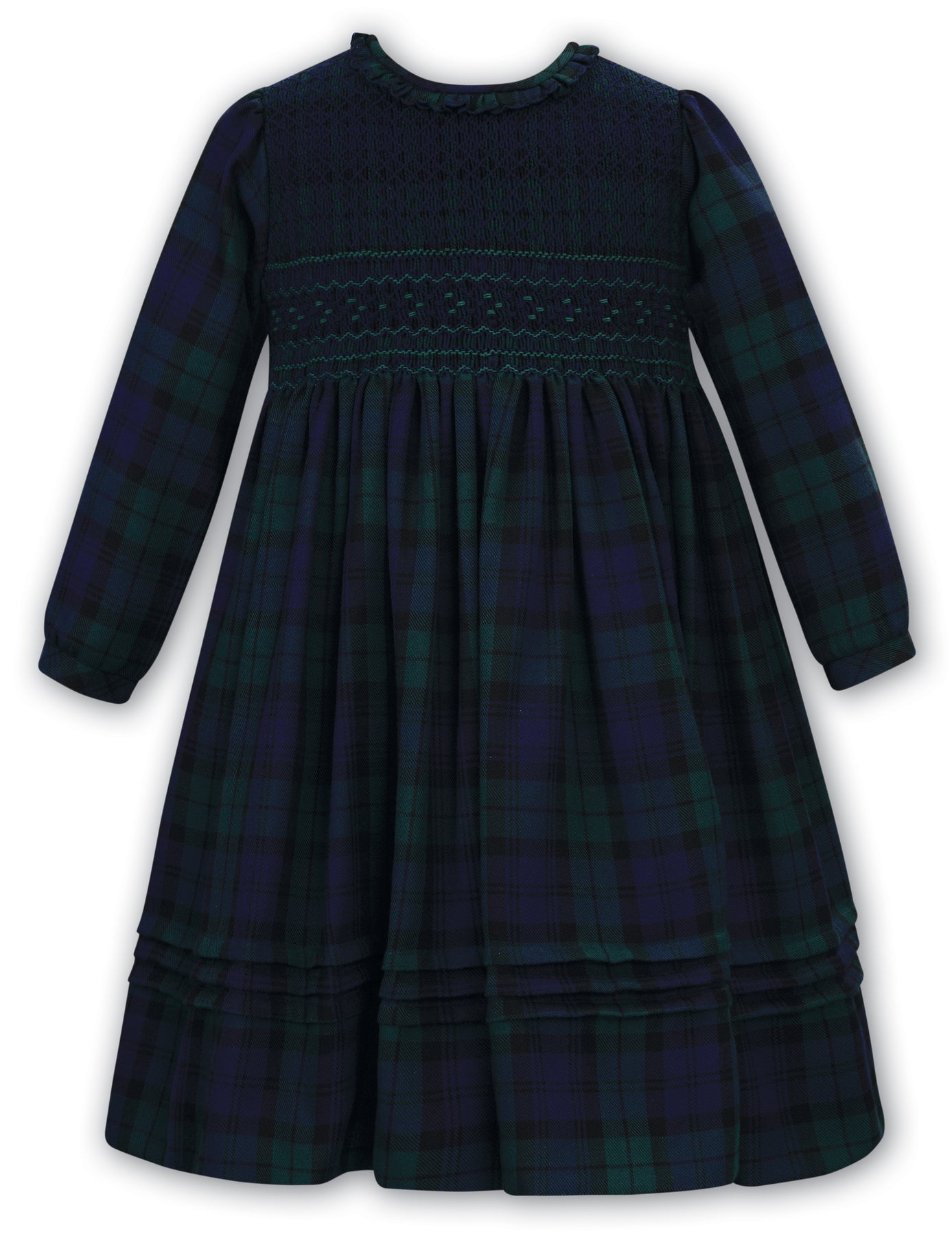 Sarah Louise *Winter Navy, Green & Black Tartan Smocked Long Sleeved Dress - 012858